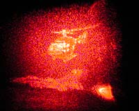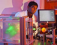 Dr. Garner's Web site contains technical details and sample holographic movies. The heart of the holographic system is the digital light processing micro-mirror chip, made by Texas Instruments and currently used in television, video and movie projectors. Those devices incorporate a computer that processes an incoming digital signal by rapidly - several thousand times a second - changing the angle of each micro-mirror to reflect light from a regular light bulb. The resulting image is a two-dimensional video projected onto a screen. One of Dr. Garner's innovations was to replace regular light with laser light. Such light is coherent, meaning it is made up of light of all one wavelength, with all light waves traveling "in phase" with one another. Light from a white light bulb comprises many different wavelengths that are out of phase. Dr. Garner's system also requires a different kind of digital signal than those feeding into today's projection TV sets. His signal is a sequence of two-dimensional interference patterns, called interferograms, which can be generated either from scratch or from data gathered from 3-D imaging applications, such as sonograms, CAT scans, magnetic resonance imaging, radar, sonar or computer-aided drafting. "This technology is potentially powerful for medical applications," Dr. Garner said. "We could easily take data from existing 3-D imaging technologies and feed that into our computer algorithms to generate two-dimensional interferograms." On a computer screen, interferograms look like tiny random black dots similar to an off-the-air TV channel's "snow." But the patterns, when fed into the digital light processing micro-mirror chip, cause the tiny mirrors to change in a way that, when laser light is reflected off them, projects a 3-D moving image that appears suspended in air, in a special material called agarose gel, or on a stack of liquid crystal plates similar to computer screens. "Holographic visualization of organs, for example, would improve diagnosis of ailments such as a swollen, damaged or malformed heart," Dr. Garner said. Other possible medical applications include visualization aids for training surgeons, measuring teeth and bone development, and viewing the possible results of plastic surgery before it's actually done. Dr. Garner's laboratory focuses on building new platform technologies and new techniques that are then applied collaboratively with a variety of experts on campus in many different fields, including aiding studies of cancer, heart disease, infectious diseases and dermatology. The holographic display research was supported by the State of Texas Advanced Research Program, the M.R. & Evelyn Hudson Foundation and the Philip O'Bryan Montgomery Jr. Endowment. Related Links UT Southwestern Medical Center SpaceWar Search SpaceWar Subscribe To SpaceWar Express