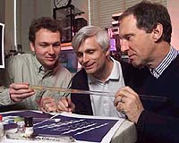 Scientists from Lucent Technologies' Bell Labs have shown that soccer ball-shaped carbon molecules known as bucky balls can act as superconductors at relatively warm temperatures, raising hopes for inexpensive, power loss-free organic electronics and other practical applications such as quantum computers. Superconductors are materials in which the resistance to the flow of electricity vanishes below a certain temperature. The Bell Labs team was able to demonstrate that bucky balls acted as superconductors below 117 Kelvin (minus 249 degrees Fahrenheit), which is more than double the previous temperature record of 52 Kelvin (minus 366 degrees Fahrenheit) set last year. Cold as the new temperature may sound, it is warm enough for the bucky ball superconductors to function while cooled by liquid nitrogen instead of the much more expensive liquid helium. "This result makes bucky balls infinitely more interesting to study," said Federico Capasso, physical research vice president at Bell Labs. "This shows that bucky balls may live up to their initial promise of being a material that will be very important to technology." Bucky balls are named after American inventor R. Buckminster Fuller, since they resemble the geodesic domes that Fuller designed. They are large molecules made up of 60 carbon atoms. In 1991, a Bell Labs team first showed that bucky balls can act as superconductors at very low temperatures when mixed with potassium. A Bell Labs team led by physicist Hendrik Schon inserted molecules of chloroform and bromoform (a chemical molecule similar to chloroform but with bromine atoms instead of chlorine atoms) in between bucky balls to create a "stretched" bucky ball crystal where the bucky ball molecules were spaced further apart than usual since the chloroform and bromoform molecules were wedged amidst them. This had the effect of lowering the electronic and molecular attraction between neighboring bucky ball molecules in the crystal. By building a sensitive electronic device known as a field effect transistor and connecting it to the crystal, the Bell Labs scientists were able to produce superconductivity in the bucky ball crystal at a record-breaking temperature of minus 249 degrees Fahrenheit. "I'm surprised, I didn't expect the temperature to go up so much," said Professor Peter Littlewood, head of theory of condensed matter physics research at the University of Cambridge, U.K., and a former Bell Labs researcher. "It's a very clean result." The only other known superconductors that work at this and higher temperatures are copper oxide superconductors. These, however, have other problems; the physics that governs copper oxide superconductors is non-conventional and not well understood, and they tend to be expensive. Nonetheless, they have already been used commercially to make powerful magnets, microwave filters and superconducting wires for power transmission systems. The bucky ball superconductors, on the other hand, are potentially less expensive, and the physics is better understood, since bucky ball superconductors seem to act as conventional superconductors. "Our results show that high temperature superconductivity is not restricted to copper oxides," said Schon. "As research continues, we can expect other surprises in the form of new materials and so on in superconductivity." Other researchers involved in this work were Bell Labs scientists Christian Kloc and Bertram Batlogg (who is also affiliated with the Solid State Physics Laboratory in ETH-Zurich in Switzerland). This information is based on a press release written by Saswato Das, Rich Teplitsky and Steve Hudik, of Bell Labs Media Relations. Related LinksBell Labs SpaceWar Search SpaceWar Subscribe To SpaceWar Express CARBON WORLDS
