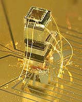A low-power, magnetic sensor about the size of a grain of rice that can detect magnetic field changes as small as 50 picoteslas - a million times weaker than the Earth's magnetic field--has been demonstrated by researchers at the National Institute of Standards and Technology (NIST). Described in the Dec. 27 issue of Applied Physics Letters,* the device can be powered with batteries and is about 100 times smaller than current atom-based sensors with similar sensitivities, which typically weigh several kilograms (about 6 pounds). The new magnetic sensor is based on the principles of a NIST chip-scale atomic clock, announced in August 2004. Expected applications for a commercialized version of the new sensor could include hand-held devices for sensing unexploded ordnance, precision navigation, geophysical mapping to locate minerals or oil, and medical instruments. Like the NIST chip-scale clock, the new magnetic sensor can be fabricated and assembled on semiconductor wafers using existing techniques for making microelectronics and microelectromechanical systems (MEMS). This offers the potential for low-cost mass production of sensors about the size of a computer chip. When packaged with associated electronics, the researchers believe the mini magnetometer will measure about 1 cubic centimeter or about the size of a sugar cube. Magnetic fields are produced by the motion of electrons either in the form of an electrical current or in certain metals such as iron, cobalt and nickel. The NIST miniature magnetometer is sensitive enough to detect a concealed rifle about 12 meters (40 feet) away or a six-inch-diameter steel pipeline up to 35 meters (120 feet) underground. The sensor works by detecting minute changes in the energy levels of electrons in the presence of a magnetic field. A tiny sample of the element rubidium is heated within a sealed, transparent cell to form a rubidium vapor. Light from a semiconductor laser is transmitted through the atomic vapor. In the presence of a magnetic field, the amount of laser light that is absorbed by the atoms changes and this is detected by a photocell. Larger magnetic fields produce proportionally bigger changes in the atomic energy levels and change the absorption by the atom. The key advantages of the new sensor, says Peter Schwindt, one of the NIST developers, are its accuracy and sensitivity given its small size. So called "fluxgate" magnetometers achieve equivalent or better sensitivity but are much less accurate and much larger. They also detect only the portion of a magnetic field pointing along the sensor, while the atomic magnetometers detect the total field strength, a desirable capability for many magnetic imaging and search applications. Superconducting quantum interference devices (SQUIDs) are more sensitive, but must be cryogenically cooled, making them substantially larger, power hungry and more expensive. "Magnetoresistive" devices like those used in heads that read computer hard drives are small and cheap, but are typically less sensitive and less accurate. A separate NIST research group has developed a new magnetoresistive magnetic sensor. P. Schwindt, S. Knappe, V. Shah, L. Hollberg, J. Kitching, L. Liew, J. Moreland. "Chip-scale atomic magnetometer." Applied Physics Letters. Dec. 27, 2004 Related Links National Institute of Standards and Technology SpaceWar Search SpaceWar Subscribe To SpaceWar Express