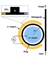 For the experiments reported in Nature, the ring used was 12 microns in diameter to resonate with laser light at a wavelength of 1,576 nanometers, in the near infrared. The ring is surrounded by an outer ring of negatively doped silicon, and the region inside the ring is positively doped, making the waveguide itself the intrinsic region of a positive-intrinsic-negative (PIN) diode. When a voltage is applied across the junction, electrons and holes are injected into the waveguide, changing its refractive index and its resonant frequency so that it no longer passes light at the same wavelength. As a result, turning the voltage on switches the light beam off. The PIN structure has been used previously to modulate light in silicon using straight waveguides. But because the change in refractive index that can be caused in silicon is quite small, a very long straight waveguide is needed. Since light travels many times around the ring resonator, the small change has a large effect, making it possible to build a very small device. In tests, the researchers found that the device could completely interrupt the propagation of light with an applied voltage of less than 0.3 volts. The researchers note in their paper that devices using a PIN configuration have been relatively slow in switching but that the ring resonator configuration also eliminates this problem. Tests using a pulse-modulated electrical signal produced an output with a very similar waveform to the input at up to 1.5 gigabits per second. The Nature paper is titled "Micrometer-scale Silicon Electro-Optic Modulator." Co-authors are Cornell graduate students Qianfan Xu and Bradley Schmidt and postdoctoral researcher Sameer Pradhan, now at Intel Corp. Related Links Cornell Nanophotonics Group SpaceWar Search SpaceWar Subscribe To SpaceWar Express