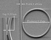 Ithaca NY (SPX) May 20, 2005 Much of our electronics could soon be replaced by photonics, in which beams of light flitting through microscopic channels on a silicon chip replace electrons in wires. Photonic chips would carry more data, use less power and work smoothly with fiber-optic communications systems. The trick is to get electronics and photonics to talk to each other. Now Cornell University researchers have taken a major step forward in bridging this communication gap by developing a silicon device that allows an electrical signal to modulate a beam of light on a micrometer scale. Other electro-optical modulators have been built on silicon, but their size is on the order of millimeters, too large for practical use in integrated circuit chips. (a micrometer, or micron, is one millionth of a meter, or one thousandth of a millimeter.) Smaller modulators have been made using compound semiconductors such as gallium arsenide, but silicon is preferable for its ability to be integrated with current microelectronics. The work is described in a paper published in the May 19, 2005, issue of Nature by Michal Lipson, Cornell assistant professor of electrical and computer engineering, and her research group. Their modulator uses a ring resonator - a circular waveguide coupled to a straight waveguide carrying the beam of light to be modulated. Light traveling along the straight waveguide loops many times around the circle before proceeding.