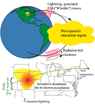atmosphere above an area spanning Oklahoma to South Dakota, researchers at Stanford have found.Theirs is the first evidence that lighting can have such a far-ranging effect -- temporarily changing the composition of the radiation belts and the ionosphere below it within an area of several hundred thousand square miles. The findings, reported in the Dec. 1 issue of Geophysical Research Letters, suggest "lightning could be an important contributor to the loss of electrons from the Earth's radiation belt, and thus helps us better understand the Earth's near-space environment," said Umran Inan, a professor of electrical engineering in Stanford's STARLab (Space, Telecommunications and Radioscience Laboratory). Inan and graduate student Michael Johnson made the observations by deploying a network of very low frequency radio receivers in the Midwest that are able to sense changes in the ionosphere -- the conducting portion of the Earth's atmosphere that begins some 40 miles above ground. The observed lightning-associated disturbances are remarkably consistent, they said, with independent theoretical predictions of radiation belt precipitation from lightning published by recent graduate David Lauben, a former student of Inan's. Scientists have known for several decades that the electromagnetic waves from lightning cause electrons to rain out of the radiation belt, "but this result indicates it occurs on a huge scale at night," Inan said. "It also must occur during the day, but the effect on the ionosphere is relatively small compared to solar ionization. At these mid-latitudes, we now think the nighttime ionosphere may be dominated by these lightning effects." Electrons trapped in the Earth's magnetic field come in from the sun as solar wind, he said, and are accelerated in the radiation belts where they stay trapped bouncing from one end of the magnetic field line to the other, until some other process comes along to release them. Lightning performs that function by launching waves upward nearly along the Earth's magnetic field lines, scattering high energy particles in both momentum and pitch angle along the route. Deflected from their trapped orbit, the electrons precipitate out into the atmosphere where they produce light, X-rays and ionization. Previously, researchers thought effective precipitation of electrons was only caused by waves traveling in tiny tubes of ionization along magnetic field lines called ducts, with lightning only affecting those trapped electrons that are confined to these narrow paths in space. The new finding indicates that electromagnetic waves from lightning populate large regions of the radiation belts from which they precipitate electrons, which means they could potentially influence loss rates of trapped particles on a global scale. Not every lightning flash behaves this way, Inan said. He and Johnson are now trying to determine when it does and doesn't. "You can imagine in a thunderstorm, particularly after a solar blast has built up the particles in the radiation belt, that you could get these splashes of particles precipitating out every second, which would have a large effect on the ionosphere," Inan said. The team has found dozens of examples. But they report in detail on the effects from a few strikes that were particularly well located for monitoring by their receiver network, including one strike in a group of flashes that lit up the sky near Austin, Texas, in the early morning hours of Oct. 18, 1998. The precipitated energetic electrons began raining down about a second after the strike and over a huge area beginning several hundred miles to the north of Austin and ending in South Dakota. "The effect may have kept on going further north," Johnson said, "but that's how far we were able to track it from our existing network." The size, location and temporal evolution of the particle precipitation area were remarkably similar to those predicted in computer simulations that Lauben had conducted beforehand for his doctoral thesis, Inan said. The ground-based receiver network, called HAIL for Holographic Array for Ionospheric Lightning research, is operated by the Stanford team in collaboration with high school students and science teachers in nine schools from New Mexico to Wyoming. The receivers are able to track changes in an area above the range of weather balloons but below the range of satellites by monitoring the effects of the changes on exceptionally stable very low frequency radio signals used for U.S. Navy communications, Johnson said. "The ground acts as one metal plate at these frequencies and the ionosphere acts as another, but the ionosphere occasionally changes its properties because of activity such as lightning, solar flares or gamma ray bursts, which in turn changes the waves propagating underneath it," he said. The high school students help maintain the receivers, do their own research projects and send data over the Internet for analysis by Inan's research group. Inan, Johnson and others in the group now have given more than 40 talks on solar-terrestrial physics and have obtained funding to sponsor three student-teacher pairs to attend the American Geophysical Union fall meeting in San Francisco.