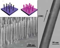 A University of Southern California engineer has discovered a way to manufacture composite "nanocables" from a potent new class of substances with extraordinary properties called Transition Metal Oxides (TMOs). Chongwu Zhou, an assistant professor in the USC Viterbi School of Engineering's Department of Electrical Engineering, is creating dense arrays of ultrafine wires made of magnesium oxide (MgO), each coated with uniform, precisely controlled layers of TMO. In the last decade, TMOs have come under intense investigation because they demonstrate a wide range of potentially highly useful properties including high-temperature superconductivity. Because of the great potential for applications and research, investigators have tried for years to create TMO nanowires, but have so far had limited success. "But now we can supply a group of previously unavailable materials to the nanotechnology community," Zhou said. The Zhou team demonstrated the technique with four different TMOs: YBCO, a well-known superconductor with a high transition temperature; LCMO, a material showing "colossal" magnetoresistance; PZT, an important ferroelectric material; and Fe3O4, known as magnetite in its strongly magnetic mineral form. The new structures all start with a new technique Zhou and his co-workers developed to create arrays of nanowires by condensing MgO vapor onto MgO plates using gold as catalyst. This leads to a forest of MgO nanowires, each 30-100 nanometers in diameter and 3 microns (100 millionth of an inch) long, all growing parallel fashion, at a constant angle to the substrate plate. "Now the magic starts," Zhou says. A laser vaporizes the TMO, which then condenses directly out of the gaseous state onto the waiting MgO cores in very precise fashion, a process called "pulsed laser deposition." The final product looks like nano-sized coaxial cable, with an MgO core and TMO sheath. "The trick is we can preserve the TMO composition using this technique," says Zhou, "while other techniques cannot." Zhou wrote in a paper recently accepted for publication in Nano Letters and now circulating on the Internet, that the assemblies "can be tailored for a wide variety of applications, including low-loss power delivery, quantum computing, ultrahigh density magnetic data storage, and more recently, spintronic applications." "We � expect that these TMO nanowires may offer enormous opportunities to explore intriguing physics at the nanoscale dimensions." Zhou, the winner of the Viterbi School of Engineering's 2004 Junior Faculty Research Award, believes that the four new nanowires are only the beginning. "Our synthetic approach will lead to other new nanostructures," he said. Working with Zhou were Song Han, Chao Li, Zuqin Liu, Bo Lei, Daihua Zhang, Wu Jin, Xiaoleiu Liu, and Tao Tang. A National Science Foundation CAREER award and DARPA supported the research. Related Links Uo Southern California SpaceWar Search SpaceWar Subscribe To SpaceWar Express