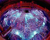 Sandia National Laboratories' Z machine, which last year emitted neutrons to enter the race to provide the world virtually unlimited electricity from, essentially, seawater, has received approval from the National Nuclear Security Administration (NNSA) to proceed with a $61.7 million refurbishment. The project is called ZR, for Z-Refurbishment. The machine's immediate purpose is to provide data to feed into supercomputers that simulate nuclear weapon explosions and to test materials under extreme conditions. "The advance will support the weapons program and materials work not only at Sandia but at Livermore and Los Alamos national laboratories," says Sandia Senior VP Tom Hunter, who managed the funding that made the new installation possible. "This significant upgrade and investment also will allow us to move to a new level of insight of z-pinches and their relationship to fusion. I give credit to the Sandia project team and NNSA for making this a reality." Eight years ago, the Z machine startled the world when a technical advance enabled the machine's power output to rise the way investors want their stock graphs to move: nearly straight up. Output for Sandia's pulsed power projects, which had increased only slowly for more than a decade, rose dramatically. For Z, just coming on line, an expected usable output of 50 terawatts rose over the next two years to 230 terawatts. This made the machine not only more valuable as a data provider for nuclear weapons simulations but also showed that z-pinches were a possible candidate for peacetime fusion. Articles noting the advance appeared in newspapers ranging from the New York Times to USA Today, and from Esquire Magazine to Scientific American. The dramatic photo of Z firing became the most widely published picture in Sandia's history, appearing (among myriad newspapers, magazines, TVs, and textbooks) as the centerfold of a National Geographic issue celebrating "Machines of the Future" and even in a recent issue of the "men's" magazine Maxim. Last year, Z researchers announced that Z had generated neutrons by imploding a small capsule filled with deuterium. This emission signaled that the machine not only theoretically but in fact had joined a select group of machines capable of executing high-quality fusion implosion experiments. The coming upgrade can only increase thermonuclear neutron emission, say Z researchers. Z's overall form will be unchanged, but its working numbers will be significantly different. Instead of 18 million baseline amps bathing the target, 26 million amps will make the journey. The X-ray usable peak emissions will rise from 230 to 350 terawatts (more than 100 times the entire world's output of electricity for a few nanoseconds.) The [x-ray] energy output will rise from 1.6 to 2.7 megajoules. In the next two years, 36 new Marx generators (large capacitors) will be installed. Exactly the size of their 20-year-old predecessors, the devices' newer technology will store twice the energy as the original installation. Thirty-six very rapid switches, formerly bathed in water and operated en masse by a single signal, will be upgraded to a system - oil-bathed for greater insulation - that alerts each switch individually when to turn on. Each switch controls the electrical current proceeding down 36 transmission lines, each as big around as a horse's midriff, thus enabling researchers to shape the machine's electrical pulse. The trigger upgrade and expected improvement in pulse shaping should make the already-overbooked machine even more valuable to researchers from Sandia, LANL, and LLNL whose calculations depend on shape-controlled electrical current flows and X-ray outputs. Jeff Quintenz, director of Pulsed Power Sciences Center, looks forward to the increase in the facility's precision. "Now we're able to produce only the same pulse shape each time, when operating with a particular experimental configuration," he says. "Without this investment, experimentalists got what we had. Now we can dial a pulse; we have 36 switches that can be timed separately instead of 36 under one control." The machine also is expected to be lower-maintenance, with less downtime between shots. Current capacity is 200 shots/year, Quintenz says. The refurbished machine will be capable of 400 shots/year, assuming operational funding is available. Finally, in terms of capability, Quintenz says, "Z was originally optimized to produce a 50-nanosecond short pulse, with high voltage to accelerate [lithium] ion beams. When we converted to Z, we had to live with a machine designed to drive ion beams. The refurbishment is optimized for high current to suit a z-pinch, not high voltage to drive ions." "This is a pretty significant engineering-and-logistics tailoring job," says Ed Weinbrecht manager of the ZR project. "We have about a year and a half to complete the design and fabricate the parts we need." Plans then are to dismantle the existing accelerator, move the oil-water separation wall to accommodate the insulation needs of the very fast switches, and install all-new pulse power systems "in what will be a hectic six-month period," says Weinbrecht. The overall Z architecture, looked at from the roof, resembles a wagon wheel. Marx generators form the outer rim of the wheel, power transmission lines imitate spokes, and a central vacuum chamber holding the target functions as a kind of axle. Z-pinches employ high amperages to vaporize tungsten wires thinner than human hairs, creating particles imploding at a million miles an hour (500km/s). These, when colliding, give up their energy in the form of X-rays. Researchers also use the intense magnetic field created by the current either to accelerate particles outward or test the strength of materials. A less obvious but no less important reason for the new upgrade, says Jeff, is "to exercise our pulsed-power engineering capability so we don't lose it." The last big pulsed-power engineering project was for Sandia'