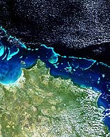 This Envisat image shows part of the world's largest coral reef, the 2300-kilometre-long Great Barrier Reef off Australia's Queensland coast, just beneath the sea surface. Properly speaking, the Great Barrier Reef is an interlinked system of about 3000 reefs and 900 coral islands, divided by narrow passages. An area of biodiversity equal in importance to tropical rainforests, the Reef was made a UNESCO World Heritage Site in 1981. Around a third of the Reef is protected as part of Australia's Great Barrier Reef Marine Park, the largest marine park in the world. Home to sharks, turtles, and 1500 tropical fish species, the Great Barrier Reef is a popular destination for scuba divers and many cities across the Queensland coast offer daily boat trips for tourists. The section of Reef seen here is towards its northern extremity, known as the Far Northern Management Area. The Reef was formed by colonies of coral polyps, which thrive in the warm, shallow waters of the Coral Sea. Each polyp lives inside a shell of aragonite, a type of calcium carbonate, and the polyps join together to form the distinctive, intricate patterns of coral. The colour in coral comes from associated species of algae that serve as food to the coral polyps. Only live coral has colour, with dead coral appearing white. Live coral grows on the accumulated skeletons of dead coral, so the Reef as a whole is growing between one and two centimetres annually. There have been reefs off the northeast coast of Australia for around 17 million years, ever since the drifting continent entered tropical waters. The Great Barrier Reef as we know it originated during the last Ice Age between 8000 and 10 000 years ago, when melting ice gradually inundated the edge of the continental shelf, forming an area suitable for coral to colonise. Queensland has no major rivers and few big towns, so the corals here are less stressed by environmental pollution than comparable reefs elsewhere. However around 400 reefs are in areas where the water quality is classed as having declined due to sediment and chemical runoff from farming, and the loss of coastal wetlands which in the past would have worked like a natural barrier. Coral reefs worldwide are increasingly under threat from coral bleaching, where the algae is expelled from the coral tissue, progressively losing its colour and eventually dying. The precise reason for coral bleaching is unknown but the phenomenon is associated with increased water temperatures, low salinity and high sunlight levels. The image is centred on Cape Melville National Park in Cape York Peninsula, a remote area of coastal mangroves, tropical rainforest, heathlands, woodlands and grasslands. The islands just offshore of Cape Melville are the Flinders Group National Park, rocky islands known for Aboriginal rock art. The mangrove-fringed bay to their west is Princess Charlotte Bay. Envisat's Medium Resolution Imaging Spectrometer (MERIS) acquired the image from which this crop has been taken on 19 August 2004, working in Full Resolution mode to yield a spatial resolution of 300 metres. The crop covers 326 by 326 kilometres. Related Links SpaceWar Search SpaceWar Subscribe To SpaceWar Express