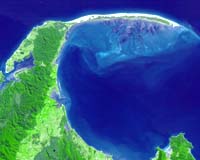 On the northern tip of New Zealand's South Island, Farewell Spit stretches 30 kilometers eastward into the Tasman Sea from the Cape Farewell mainland. A sandy beach faces the open waters of the Tasman Sea, while an intricate wetland ecosystem faces south toward Golden Bay. On the southern side, the spit is protected by several kilometers of mudflats, which are alternately exposed and inundated with the tidal rhythms of the ocean. The wetlands of Farewell Spit are on the Ramsar List of Wetlands of International Significance. This image from the Advanced Spaceborne Thermal Emission and Reflection Radiometer (ASTER) on NASA's Terra satellite shows Cape Farewell (left) and Farewell Spit. The sandy dunes on the north side of the spit give way to green vegetation along the southern perimeters. The image captured a great amount of detail of the submerged tidal flats, which appear in shades of bluish-purple. The flats are etched with many channels, giving the flats the appearance of underwater mountains and canyons. Near the shore, the blue-purple color of the flats is tinged with green (see high-resolution image), suggesting the area is home to aquatic plants that can tolerate daily flooding. More than 80 species of wetland birds have been observed at Farewell Spit. Among them are numerous species of migratory shorebirds traveling the East Asia-Australasia flyway. Some birds arrive for the summer, while others fly in for the winter. According to the New Zealand Department of Conservation, the tidal mudflats on Farewell Spit are also an important molting (feather shedding and replacement) site for 12,000 black swans. Related Links SpaceWar Search SpaceWar Subscribe To SpaceWar Express
