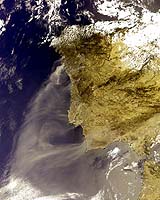 Plumes of smoke from serious wildfires across Portugal fan into the Atlantic in this Envisat satellite view acquired on 21 August. Dozens of wildfires are reported throughout the country, which has suffered one of its worst droughts for decades. Fanned by high winds, the fires have destroyed more than 140 000 hectares of land and killed at least 15 people. Stricken areas include the vicinity of the city of Coimbra, Portugal's third largest city, around 200 km northeast of Lisbon. On the outskirts of the city firefighters are attempting to keep the blazes at bay. Other fires are reported to be burning in the northern districts of Viseu and Viana do Castelo. Firefighting aircraft from France, Germany, Italy and the Netherlands are participating in control activities following an appeal for help by Portugal's government. This international assistance supplements a national firefighting effort of 49 aircraft, around 800 vehicles and 3000 firefighters. The images here come from the Medium Resolution Imaging Spectrometer (MERIS) aboard Envisat, Europe's largest-ever Earth Observation satellite, operating in Reduced Resolution mode for a spatial resolution of 1200 metres. Related Links SpaceWar Search SpaceWar Subscribe To SpaceWar Express