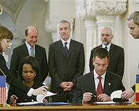 The US government Wednesday sought to reassure Russia about the new agreement for American military bases in Romania after its former Cold War enemy questioned the future of the treaty limiting conventional armed forces in Europe. "The agreement signed yesterday (Tuesday) is not only completely consistent with CFE obligations, it is also consistent with every declaration and every understanding that NATO has ever made with Russia," said a US official travelling with US Secretary of State Condoleezza Rice. "It is well within that margin of comprehension, so there is no basis for Russia to be concerned." Rice signed on Tuesday an historic agreement with Romania to establish permanent US military bases in that country, the first-ever in a former Warsaw Pact nation. However the announcement caused concern in Moscow with Russian Defence Minister Sergei Ivanov saying on Wednesday that "the expansion of NATO and US installations up to Russia's borders calls into question the future of the CFE (Conventional Armed Forces in Europe) treaty". "Russia is currently fulfilling all its obligations under the treaty. But if we see that the other countries are ignoring it, we draw conclusions from that," Ivanov said on Russian public television. The 1990 CFE treaty was aimed at limiting the deployment of conventional arms by NATO and the Warsaw Pact nations. After the fall of the Soviet Union in 1991, it was remodelled in 1999. The threats of Russian withdrawal from the CFE treaty comes amid a meeting between foreign ministers of NATO countries and their Russian counterpart Sergei Lavrov in Brussels. The centre for the US's so-called Eastern European Task Force (EETAF) will be at the air base near Constanta on the Romanian Black Sea coast, said a State Department official who asked not to be named. The expected 1,500-strong US force will also use three other sites in Romania -- Smardan training range, Babadag training area and Cincu training range. Source: Agence France-Presse Related Links SpaceWar Search SpaceWar Subscribe To SpaceWar Express