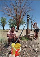 Los Angeles - November 19, 1999 - New research by NASA Goddard and University of California, Los Angeles scientists to be published in the Nov. 19th issue of the journal Science, shows that the devastating drought that plagued North Africa for decades may be a natural phenomenon-fueled by the land's naturally-changing vegetation cover.Scientists have been trying to understand what caused the paralyzing drought that began in the 1970s, ravaging North Africa and causing the Sahara desert to advance to the south. Some studies suggested that by using the land for farming and livestock grazing, humans were responsible for bringing about the drought and keeping the land from recovering. Caption: Picture dated 13 February 1992 shows South African children filling a bucket of water the village's well. An international conference water management due to open in Paris 19 March aims to replace the rhetoric of previous talks with practical measures to better channel the planet's dwindling fresh-water resources. UN figures show 1.5 billion people around the world have little or no access to drinking water, a statistic which prompted French President Jacques Chirac to propose the UNESCO-backed conference grouping 84 countries. Photo Copyright AFP Researchers have found that previous drought conditions in Africa grasslands cause following years to remain drier, over-riding meteorological conditions which otherwise would have caused more rain to fall. The approach scientists took was to put natural vegetation in a (computer) climate model and make it fully interactive with land surface processes and atmospheric processes," said William Lau, a Goddard Space Flight Center (Greenbelt, Md.) atmospheric scientist. Lau, along with UCLA atmospheric scientists Ning Zeng and David Neelin, found that the addition of vegetation to climate computer models proved to be the missing link in what was driving the drought. "The Sahel has gone through a well-known drought in the 70s and 80s, and it is a huge economic concern for the countries in the Sahel region like Nigeria, Niger and Mali," said Zeng. "One school of thought has blamed the drought on the lack of rainfall caused by changing temperatures of the ocean surface." Other studies, said Zeng, claim the drought is more man-made. In trying to decipher the true cause, the team used a computer climate model to see how much of the drought could be accounted for by the cooler sea surface temperatures that suppress summer monsoons and bring less rain to the Sahel region. Lau said the model showed that changing sea surface temperatures couldn't account for much of the drought at all. "If you look at the sea surface temperature as a drought forcing phenomenon over 50 years, you see a very weak drought, not enough to explain the observed variance and the long term severity of the drought," he said. To find what else may be causing the decades-long dry spell, the scientists added another factor -- soil moisture -- to the climate model. They found that as the soil dried out, the air lost humidity, making the chance of rain decrease even more. But still, said Lau, it was only enough to account for a drought half as severe as what actually happened in the Sahel. Finally, the team added natural vegetation to the model and found that the natural vegetation interacts significantly with climate, and in the case of the Sahel drought, caused enhanced drying. "The way it works is when it gets dryer due to changes in sea surface temperature, less vegetation grows. And less vegetation leads to higher surface albedo," said Zeng. A higher surface albedo -- or a greater amount of reflected solar radiation -- leads to a drier, cooler climate. The cooling effect weakens the monsoon circulation, and less moisture comes in from the south and the west, he said. Also, since plants transpire by losing water through their leaves, less vegetation decreases humidity. The loss of a direct moisture supply means less rainfall, which causes weaker circulation, dampening the monsoon season. "This is the first time a realistic global model is able to show the interactive natural vegetation on a time scale of decades," said Zeng. Lau said that the new model including natural vegetation changes is a much better reflection of what the Sahel region actually experienced. And it suggests that without the addition of man-made landscape changes, the climate system is fully capable of generating this devastating type of drought.