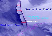 Washington - May 15, 2000 - Three massive icebergs have calved from the Ronne Ice Shelf in the Weddell Sea, the National Ice Center in Suitland, Md., reports. The center is a tri-agency activity with representation from the U.S. Navy, NOAA, and the U.S. Coast Guard. The dimensions and locations of the icebergs are: