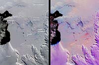 These two images of Pine Island Glacier in Antarctica show the recently discovered 25-kilometer (15-mile) long crack that scientists expect will turn into a large iceberg within the next 18 months. The views from NASA's Multi-angle Imaging SpectroRadiometer (MISR) on the Terra satellite also reveal differences in the ice sheet's surface texture, highlighting surface fractures and enabling distinction of rough crevasses from smooth blue ice. The image data shown was acquired on December 12, 2000, during Terra orbit 5246. At left is a conventional, true-color image from the downward-looking (nadir) camera. The false-color image at right is a composite of red-band data taken by the MISR forward 60-degree, nadir, and aftward 60-degree cameras, displayed in red, green and blue, respectively. Color variations in the true-color image at left highlight spectral differences. In the multi-angle composite, on the other hand, color variations act as a proxy for differences in the angular reflectance properties of the scene. In this representation, clouds show up as light purple. Blue to orange gradations on the surface indicate a transition in ice texture from smooth to rough. For example, the bright orange carrot-like features are rough crevasses on the glacier's tongue. In the conventional nadir view, the blue ice labeled "rough crevasses"' and "smooth blue ice" are similarly colored, but the multi-angle composite reveals their different textures, with the smoother ice appearing dark purple instead of orange. This could be an indicator of different mechanisms by which this ice is exposed. The multi-angle view also reveals subtle roughness variations on the frozen sea ice between the glacier and the open water in Pine Island Bay. To the left of the 'icebergs' label are chunks of floating ice. Smaller icebergs embedded in the frozen sea ice are visible below and to the right of the label. These small icebergs are associated with dark streaks. Analysis of the illumination geometry suggests that these streaks are surface features, not shadows. Wind-driven motion and thinning of the sea ice in the vicinity of the icebergs are a possible explanation. Recently, Robert Bindschadler, a glaciologist at the NASA Goddard Space Flight Center discovered in Landsat 7 imagery a newly-formed crack traversing the Pine Island Glacier. This crack is visible as an off-vertical dark line in the MISR nadir view. In the multi-angle composite, the crack and other stress fractures show up very clearly in bright orange. Radar observations of Pine Island Glacier in the 1990's showed the glacier to be shrinking, and the newly discovered crack is expected to eventually lead to the calving of a major iceberg. Related Links SpaceWar Search SpaceWar Subscribe To SpaceWar Express