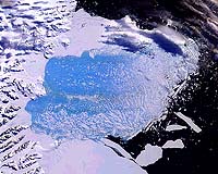 NASA instruments flying on the Terra satellite have observed the calving of an iceberg and the breakup of an ice shelf in Antarctica, roughly 2,100 kilometers (1,300 miles) from one another. Last month, a large crack developed in the Thwaites Tongue, a large sheet of glacial ice that extends from the West Antarctica mainland into the southern Amundsen Sea. A piece broke away, or calved, forming an iceberg designated B- 22 by the National Ice Center. In February, a section of the Larsen B ice shelf, located on the familiar finger-like Antarctic Peninsula, collapsed and broke away from the peninsula. The progression of both breakups were initially observed by NASA's Moderate Resolution Imaging Spectroradiometer. Images of the subsequent calving and ice shelf breakup were captured by NASA's Multi-angle Imaging SpectroRadiometer. The B-22 iceberg measures approximately 82 kilometers (about 32 miles) long by 62 kilometers (about 24 miles) wide. Comparison of the images shows the iceberg, located below and to the left of center, has drifted away from the ice shelf. The breakup of ice near the shelf edge, in the area surrounding B-22, is also visible in the later image. These natural-color images were acquired on March 10 and 24, 2002, respectively. Antarctic researchers have reported an increase in the frequency of iceberg calving in recent years. It has not yet been established if this is a result of regional climate variation or the global warming trend. The two views of the ice shelf breakup, acquired on March 7, 2002, provide helpful chemical and topographical perspectives. In the left-hand image, near-infrared, red and blue data from the Multi-angle Imaging SpectroRadiometer's nadir (vertical-viewing) camera causes water ice within the ice shelf to appear vibrant blue. Water has an intrinsic blue color due to the selective absorption of longer wavelengths such as red and infrared, and the translucent properties of ice within the collapsing shelf enables this absorption to be observed. Data from three different cameras on the instrument and one color channel were combined to create the multi-angle composite on the right. Because vertical protrusions or depressions within textured surfaces appear brighter on their illuminated faces, the orange color in the multi-angle composite suggests a rough ice surface. Related Links Ice Shelf Images B-22 Iceberg Images The Multi-angle Imaging SpectroRadiometer SpaceWar Search SpaceWar Subscribe To SpaceWar Express