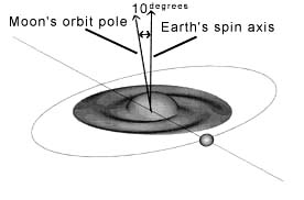 The mysterious tilt of the moon's orbit is probably a natural consequence of the moon's formation from a giant collision with early Earth, according to a new study by scientists at Southwest Research Institute (SwRI).The moon's orbit can be traced backwards in time to reveal that when the moon formed near the Earth, its orbit was inclined by approximately 10 degrees relative to the Earth's equator. Most other planetary satellites in the solar system have orbital inclinations smaller than 1 or 2 degrees. The cause of the moon's large orbital tilt has long been a mystery. "The inclination problem had been one of the last remaining obstacles for the impact hypothesis of moon formation," says SwRI Institute Scientist Dr. William R. Ward. The widely favored "giant impact theory" proposes that a Mars-sized body collided with Earth 4.5 billion years ago, creating a hot disk of debris from which the moon accumulated. Previous models of the moon's formation from such a disk predict that the lunar orbit should have been nearly aligned with the Earth's equator, with only about a 1 degree tilt. The new theory, published in the February 17 issue of Nature, proposes that the moon acquired its large tilt soon after it formed because of a gravitational interaction with debris left over from the impact event. Modeling results presented in the paper, authored by Ward and SwRI planetary scientist Dr. Robin M. Canup, show that the moon could have acquired its 10 degree tilt as a consequence of the moon-forming impact. To yield a lunar-sized moon, the giant impact must place about two lunar masses of material into an Earth-orbiting disk, according to Canup. In the model, debris particles in the inner regions of such a disk are prevented from coalescing by Earth's gravity, which tends to pull objects apart. Instead, the moon rapidly coalesces at the outer edge of the debris disk, at a distance of about 14,000 miles from the Earth. "The newly formed moon would have likely co-existed for some time with an inner disk of gas and debris left over from the impact," says Canup. After the moon coalesced, its gravity would generate waves in the inner disk. The gravitational interaction of the moon with these waves would, in turn, modify the lunar orbit. The waves are launched at certain locations in the disk where the motions of disk particles are in resonance with the motion of the moon. The waves generated at one such resonance -- where the orbital period of the moon is approximately three times that of the disk particles -- are called "bending waves," which corrugate the surface of the disk. The gravitational attraction between the moon and these rippled waves in the disk then acts to amplify the tilt of the moon's orbit. Ward and Canup's model simulated the interaction of the moon and the inner debris disk, assuming that the moon formed in an orbit with only a 1 degree tilt. They found that the interaction of the moon with the bending waves it generates in such a disk can amplify the lunar inclination to values as high as 15 degrees before the disk dissipates. The required tilt of about 10 degrees can be achieved if the disk contained at least 25 to 50 percent of a lunar mass and persisted from decades to as long as a century. These values are consistent with those predicted by other models of the impact event. "This theory explains the moon's anomalous orbital tilt as a natural consequence of its formation from a giant impact event," says Ward. "Rather than producing conflicting evidence, the lunar inclination may now represent an additional corroboration of the impact event," agrees Canup.