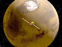 But the favored view, at least until MGS arrived, was that most of Mars' early CO2 gradually dissolved into its surface liquid water and then reacted with Mars' silicate crustal rocks to form solid carbonate minerals. On Earth, the process of "crustal tectonics" (or, as it's often called, "continental drift") eventually -- after periods of up to 100 million years -- drags these surface carbonates down into Earth's hot interior, where they're broken down by the heat and their CO2 is then belched back up to the surface by Earth's volcanoes to begin the cycle all over again. But Mars, because it's smaller than Earth and so has more area relative to its interior volume, could never store up nearly as much trapped subsurface heat from the traces of radioisotopes in its rocks. And since it's that excess internal heat that drives crustal tectonics, Mars had none -- and so, after most of its CO2 air had been turned into surface layers of carbonate minerals, it remained in that form permanently. Its air was gone for good. And without the greenhouse warming from that dense blanket of CO2, all the planet's surface water froze solid, forming a layer of permafrost (the so-called "cryosphere") several kilometers thick. This process was, of course, gradual.