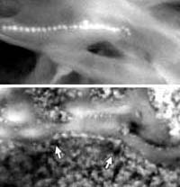 An international team of researchers has discovered compelling evidence that the magnetite crystals in the martian meteorite ALH84001 are of biological origin. The researchers found that the magnetite crystals embedded in the meteorite are arranged in long chains, which they say could have been formed only by once-living organisms. Their results are reported in the Feb. 27 Proceedings of the National Academy of Sciences. "The chains we discovered are of biological origin," said Dr. Imre Friedmann, an NRC senior research fellow at NASA's Ames Research Center in California's Silicon Valley and leader of the research team. "Such a chain of magnets outside an organism would immediately collapse into a clump due to magnetic forces," he said. The chains were formed inside organic material whose structure held the crystals together. "The end result looks somewhat like a string of pearls," Friedmann noted. Each magnetite crystal in the chain is a tiny magnet, approximately one-millionth of an inch in diameter. Magnetite is an iron oxide, similar to iron rust. The chains may have served as 'compasses' for the host magnetotactic bacteria, so named because they navigate with the help of the magnetic crystal chains inside their bodies. The chains were preserved in the meteorite long after the bacteria themselves decayed. The researchers say the magnetite chains probably were flushed into microscopic cracks inside the martian rock after it was shattered by an asteroid impact approximately 3.9 billion years ago. This cataclysmic event on Mars' surface also may have killed the bacteria. The same, or a later, asteroid impact ejected the rock, now a meteorite, into space. Another NASA research group, led by Kathie Thomas-Keprta of NASA's Johnson Space Center, report in the same issue of PNAS that the magnetite crystals inside the meteorite are similar to those formed by 'modern' magnetotactic bacteria now living on Earth. The team studied only single crystals, however, not the elusive chain-like structures. Friedmann's team discovered the crystal chains using a technique that enabled them to 'see' the tiny chains inside the meteorite without destroying them. Besides the chain-like formation, the team discovered that individual crystals are of similar size and shape, do not touch each other and that the chains themselves are flexible, further evidence of biological origin. "Until now, studying life has been like trying to draw a curve using only one data point -- life on Earth," said Friedmann. "Now we have two data points to draw life's curve." The next step is to find the remains of the bacteria themselves, he said. The fact that a small (about 4-pound) meteorite from a planet contains large numbers of bacteria suggests that such bacteria were widespread on the surface of Mars, the researchers say. A stone of similar size from Earth would contain many bacteria. In addition, since magnetotactic bacteria require low levels of oxygen, this finding indicates that photosynthetic organisms, the source of oxygen in the atmosphere, must have been present and active on Mars 3.9 billion years ago. "Finding evidence of life on Mars is one of the central problems in astrobiology research today," said Dr. Michael Meyer, head of NASA's astrobiology program, which funded the research. In addition to his fellowship at NASA Ames, Friedmann, who is best known for discovering microorganisms living inside desert rocks, is professor emeritus of biological science at Florida State University. Members of the research team include Dr. Jacek Wierzchos (University of Lleida, Spain), Dr. Carmen Ascaso (CSIC, Madrid, Spain), and Dr. Michael Winkelhofer (University of Munich, Germany). The meteorite ALH84001 was found in the Allen Hills region of Antarctica in 1984 by researchers supported by the National Science Foundation's Antarctic Search for Meteorites Program, a joint effort by the NSF, the Smithsonian Institution and NASA. Case Western Reserve University in Cleveland manages the program. Related Links Ames Research Center SpaceWar Search SpaceWar Subscribe To SpaceWar Express
