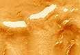 Mars - March 23, 1999 - It is summer in the martian northern hemisphere, yet patches of frost or snow persist in some areas of the northern plains. Winter ended eight months earlier, in July 1998.Recently, the Mars Orbiter Camera (MOC) passed over a relatively small impact crater located at latitude 68�N (on the Vastitas Borealis plain, north of Utopia Planitia) and took the picture seen at the left, above. The curved crater rims are visible in the upper and lower quarters of the image, and the crater floor is visible at the center right. The picture on the right is a magnified view of the crater rim area outlined by a white box in the image on the left. The bright patches are snow or frost left over from the martian winter. These snow fields are so small that a human could walk across one of them in a matter of minutes--or perhaps sled down the small, sloping patch that is seen in a shadowed area near the lower left. In winter, the entire scene shown here would be covered by frost. The long strip at the left covers an area 3 km (1.9 mi) wide by 26 km (16 mi) long. The expanded view on the right covers an area 2.9 km (1.8 mi) by 5.3 km (3.3 mi). Illumination is from the upper right.