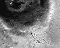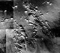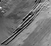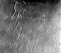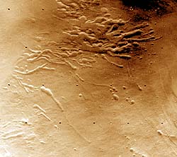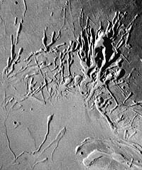 Pavonis Mons erosional valley system: Southwest segment. Looking at the systems respectively on the southwest and northeast flanks of Pavonis Mons (figures 5 and 6) individual depressions within the southwest segment (figure 5) are characterized by a near-circular, upper terminus - from which extends a graben like depression that becomes narrower down-dip. Down-dip the depression tails are intertwined forming a network or irregular relief. This segment is regarded at an early evolutionary stage.