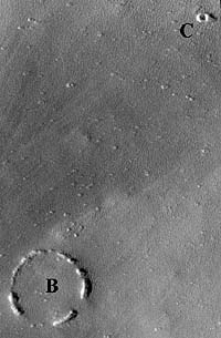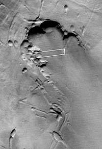 Fortunately, the Mars Global Observer captured an image of the valley floor that extends into the valley walls. The location of this image within the valley is given on figure 7. The image on figure 8 (MO401369) shows that the valley floor is riddled with small impact crater remnants. The larger of the crater remnants have "black eye" crater center. The image shows hundreds of still smaller remnants. Erosion has consistently acted on the remnants in a down-dip direction to the extent that there is an up-dip head and a down-dip tail. For the crater remnants direction of tail extension is perfectly parallel. A darker colored sediment, probably of air-borne origin, is draped over the valley floor. Its pattern runs obliquely with that of the erosional direction.