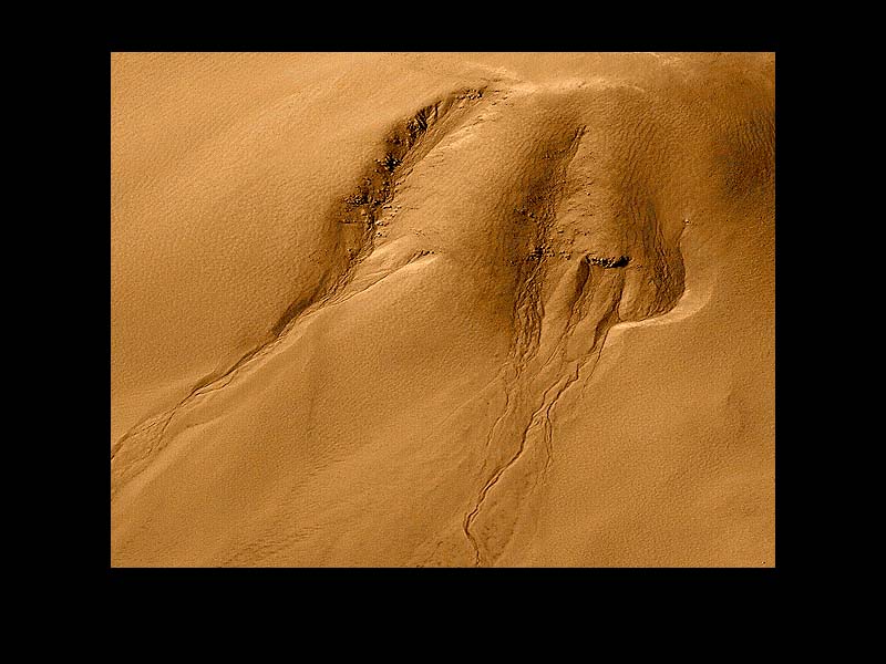 by Bruce Moomaw Cameron Park - June 27, 2000 - When the eagerly-awaited press conference was held Thursday on the new revelations by Mars Global Surveyor Surveyor, it quickly became clear that -- instead of discovering clear and unambiguous evidence of present-day near-surface Martian groundwater-- MGS had discovered something much more ambiguous and mysterious. The new photos certainly show eruptions of something from strata a few hundred meters below the Martian surface in some areas -- something that has flowed down slopes in a way that looks very much like flows of released groundwater on Earth -- but they are being seen in precisely the least likely areas: the coldest slopes on Mars rather than the warmest. All the observed eruptions occur at latitudes higher than 30 degrees (except for those on the walls of the Nirgal Valley, which occur at 27 degrees South). Twenty five percent occur on the walls of pits in Mars' south polar regions. While overall some ninety of them occur in Mars' southern hemisphere -- covered with high-altitude highlands -- rather than the lower-altitude plains of the northern hemisphere. And fifty percent occur on slopes facing poleward, as compared to only twenty percent on slopes facing toward the equator. As discoverers Michael Malin and Ken Edgett noted in their "Science" article, "These features spend as much as half a Martian year at or near the freezing point of carbon dioxide [at Martian pressures, -125 deg C]." Yet they do look exactly like the arroyos carved on earth by running water released from springs. The scientists at the press conference can be excused for expressing puzzlement as to just what's going on here. At the moment there are several competing theories. The one favored by discoverers Michael Malin and Ken Edgett themselves is that what we're seeing might be called "miniature violent liquid-water outbursts". In this model, liquid groundwater -- which, most scientists already believed, exists in Mars' warmer subsurface layers two or more kilometers down -- is forced upward to near Mars' surface by some process and trickles through the cracks and pores of a layer of bedrock until it reaches a slope where the rock layer is exposed to Mars' surface. The first water to reach this area instantly boils ("sublimates") into vapor in the low pressure of Mars' near-vacuum atmosphere -- but as it does so, it drops sharply in temperature. And on colder slopes, this lowers its temperature enough that much of the liquid water immediately behind it freezes solid, forming a plug of ice that seals off the pores leading to the outside. (The backpacks of the Apollo moonwalkers used exactly the same setup in their cooling systems, with a tank of water separated from the lunar vacuum only by a porous plate whose pores were plugged by ice.) Thus, while on warmer slopes there is a continuous slow stream of released water vapor as more liquid water is transported up from underground, on the colder slopes the pressure behind the plug builds up until the plug finally bursts explosively -- releasing an explosive spurt of liquid water, mud and rock fragments that pours for hundreds of meters down the slope before the liquid water has time to boil completely into vapor. Then the temperature drop from this explosive depressurization causes a new ice plug to form in the vent area, and the process begins all over again.
