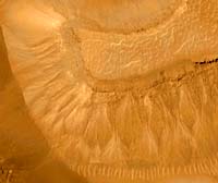 by Bruce Moomaw Cameron Park - July 5, 2000 - A clathrate mixture of CO2 and water ice, as long as it's under a fair amount of pressure, can actually exist in a solid form even if the ground is somewhat warmer than the melting point of ordinary water ice. If such a buried clathrate deposit was suddenly exposed by a landslide, the result would be a blast of liquid water -- squirted outward by the pressure of the vaporizing CO2 -- which could pour down the slope for some distance before vaporizing in the thin Martian air. [Since a rise in buried clathrate's temperature -- produced by geothermal warmth or a change in Mars' long-term climate -- could cause it to erupt in the same way, this is actually a variant on the "soda-water fountain" theory I described in Part 1 of my report -- except that the eruption of soda water would be released by "uncapping the bottle" through a landslide, rather than by through a temperature rise.] The obvious problem here is that, for the water part of the released clathrate to turn into liquid water rather than remaining a shower of ice fragments, the eruption would have to occur where the ground temperature was above 0 deg C. -- and the gullies are all in much colder areas. A possible way out of this problem, however, would be for the water part of the clathrate to be highly salty. As I mentioned in Part 1, some brines made out salts that are thought to be very common in Mars' soil -- such as magnesium sulfate and calcium sulfate -- have melting points dozens of degrees below that of pure water. And such "briny clathrates" might exist in solid form in these cold regions, but still be warm enough to turn into a short-lived torrent of liquid brine when a landslide released the pressure on them. There is also, perhaps, one more long-shot possibility. Carbon dioxide can't exist in liquid form under the 1-bar pressure of Earth's atmosphere (thus, frozen CO2 is known as "dry ice" because it sublimates directly from solid into gas). However, liquid CO2 can exist if the pressure is more than 5 bars -- and so there's a real possibility that large amounts of it may also exist underground in some regions of Mars. If a landslide released such a deposit, it just might remain liquid long enough to pour down a slope in the same manner as liquid water before boiling into gas. This, however, is unlikely -- Tanaka points out that such high-pressure liquid CO2 would explode into gas almost immediately on exposure to Mars' near-vacuum, and he thinks that - unlike released liquid water - it would have almost no time to pour down a slope in still-liquid form. Carr, however, disagrees, and that this theory cannot be completely ruled out.) Another problem is that for CO2 to be under enough pressure to exist in liquid form, it must be much more deeply buried than a water ice-CO2 clathrate -- under at least 30 meters of Martian soil and rock -- and landslides big enough to suddenly unearth such a deposit would have to be a lot larger. However, it's possible that a smaller landslide could make the covering layer of rock and soil over such a deposit shallow enough that the underlying pressure of the liquid CO2 could cause it to burst out into the open. More discussion will probably be necessary to decide whether there's any chance at all that this theory is feasible. Indeed, obviously a lot more investigation will be necessary before we can decide which of the alternative models being suggested is correct. We simply do not yet know enough about Mars' subsurface, or its long-term climate changes, to begin to decide. And if liquid water (briny or otherwise) does exist even part of the time near Mars' surface, the implications for the possibility of life on Mars are obviously enormous. In the last part of this series, I'll discuss the various ways in which future spacecraft may investigate this new Martian surprise, and allow us to determine its real nature.
