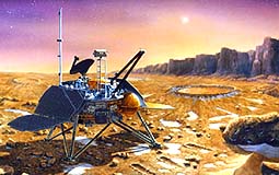 by Bruce Moomaw Cameron Park - July 11, 2000 - One proposal that had already been made for studying Martian slopes is to have one light rover linked by a cable to a heavier one at the slope's top, so that it could "rappel" down the slope -- but clearly this is something for the moderate rather than the immediate future. What this discovery seems to do is to further confirm a conclusion that more and more Mars scientists were already leaning towards -- namely, that before we dispatch any large number of new Mars landers, we badly need to do very extensive and detailed aerial reconnaissance of the planet's surface in order to find the best and most interesting possible landing sites. Dr. John Kerridge of the University of California at San Diego has been particularly forceful on this subject. As he pointed out even before the failures of the 1998 Mars probes, unmanned Mars sample return missions will always be expensive and infrequent -- and each of them will return at most a few kilograms of samples. And since it's fairly difficult to find ancient microbial fossils even on Earth, clearly such Mars missions will have to be very carefully targeted toward the best possible landing sites in order to have any reasonable chance of returning such fossils from Mars. He thought that NASA's existing plan of launching sample-return vehicles as early as 2003 was wildly premature -- and, indeed, the failure of the 1998 Mars probes may to some extent have been a blessing in disguise, by forcing NASA to completely revise that strategy. Moreover, MGS' super-detailed orbital photos of Mars' surface have shown that it is even more varied and complex than anyone had anticipated -- and that there are a wide variety of physical processes taking place on its surface that we don't yet properly understand. The first step in such aerial reconnaissance will be the next Mars Surveyor orbiter scheduled for launch next April and arrival in October. The Orbiter carries two main instruments, both of major use in this field. One is a reflight of the gamma-ray and neutron spectrometer lost in 1993 on Mars Observer. Not only can it identify some key elements that will allow the overall rock types on Mars' surface to be identified, but it can also detect hydrogen in the upper soil -- which is directly proportionate to the amount of water ice there. Its gamma-ray portion can detect ground ice at a depth of about 15 centimeters, while its neutron portion can detect it at a depth of 1 meter -- allowing some gauging of just how close to the surface such ice is, as well as a better overall understanding of how much groundwater Mars does have. But its spatial resolution is very poor: only about 300 km. The other instrument is "THEMIS", a thermal-emission infrared camera that will take pictures of most of Mars' surface in 10 different spectral bands simultaneously, with a resolution of only 100 meters. The thermal-emission spectrometer already studying Mars on MGS has the ability to sense many minerals that would be produced by ancient Martian liquid water in contact with rocks (such as carbonates and sulfates) -- but its resolution is a fuzzy 3 km, so that it simply is not sharp-eyed enough to detect small local outcrops of such minerals such as are likely to exist on Mars. And, indeed, MGS so far has not detected any sign of surface carbonates or sulfates, although they were expected on theoretical grounds to exist on or near the surface. But THEMIS, with its sharper eyesight, should have a far better ability to detect such minerals in small patches. A full-fledged mapping thermal-IR spectrometer (like the high-resolution shorter-wavelength near-IR mapping spectrometers on the Galileo and Cassini spacecraft) is still too heavy and bulky an instrument to fly easily on a small spacecraft -- but THEMIS, with its ability to take pictures in 10 different spectral bands, should still be able to clearly identify most of the scientifically interesting minerals. And it will be used to observe the identified runoff sites to see whether there are indeed minerals there produced by liquid water. Moreover, THEMIS will map Mars' nighttime surface with equal sharpness to look for local geo thermally warmed spots, with a sensitivity of only 1 deg C. If any of the possible runoff locations are still warmer than normal -- such as would be the case if liquid water was still very close to the surface -- it can confirm it.