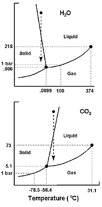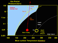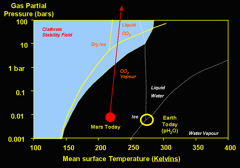 The role of CO2 on Mars Because of this, liquid CO2 cannot exist on Mars' surface despite the fact that the temperature range for Mars is perfect for liquid CO2 (except in polar regions where it is too cold). However, it is a well known fact that underground the pressure increases due to the weight of rocks overhead. One does not need to go down more than a few hundred metres before the pressure is sufficient for liquid CO2 to be stable. Of course, some sort of seal is required, otherwise the CO2 will escape up cracks and between the individual grains of Mars' regolith, but a thin layer of impervious rock, or more probably a clotting layer of water ice can easily provide such a seal.