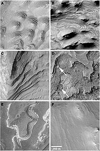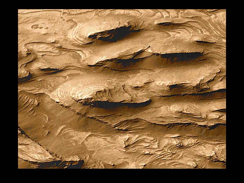Layered geologic outcrops on Mars, that will be described in this week's issue of the journal Science -- may be composed of sedimentary rock that dates from the earliest span of martian history, between 4.3. and 3.5 billion years ago. Images of these sedimentary rock exposures, captured by the Mars Orbiter Camera (MOC), suggest that parts of ancient Mars may have resembled a land of lakes, and that the geology of early Mars was much more dynamic than previously suspected. If life existed on Mars during this time period, researchers believe that the fossil remnants of that past life may be sandwiched within the sedimentary rock layers, just as they are on Earth. The martian outcrops, in some cases a few kilometers thick, appear to be made of fine-grained materials deposited in horizontal layers, the hallmark of sedimentary rock. These outcrops are found inside craters, between craters, and within chasms, said Michael C. Malin and Kenneth S. Edgett of Malin Space Science Systems in San Diego, California. The Science researchers identified three main outcrop types from the MOC images: layered units, massive units, and thin mesa units. Layered units, as their name suggests, consist of relatively thin rock beds -- some only a few meters thick -- stacked on top of one another in distinct groups. Massive units appear as one bulky rock layer with no clearly defined horizontal bedding. In a few cases, these types appear together, with the massive unit always perched on top of the bedded unit like a thick, indistinct coat of frosting on a layer cake. Thin mesa units, with surfaces ranging from smooth to pitted to ridged and grooved, are almost always found on top of eroded massive or layered sedimentary rock. While sediments can be deposited in a variety of ways -- including wind, water, volcanic activity, and even cosmic impact -- the prevalence of the martian sedimentary outcrops within basin-like features suggests that they were deposited by water, perhaps in lakes that formed within the craters and chasms, said Malin and Edgett. Under this scenario, sediments may have been transported into the lakes in regular, swift pulses, building up thin layer units. Massive units may have been deposited when the lake became stagnant or deep enough to cause sediments to sift down through the water over longer intervals. "Some of the MOC images of these outcrops show hundreds and hundreds of identically thick layers, which is almost impossible to have without water," said Malin. The sedimentary units show no telltale signs of wind deposition, and the researchers concluded that explosive volcanic eruptions and impact cratering probably could not have produced enough sediment to create the large-scale and geographically widespread outcrops seen on the martian surface. Although Malin and Edgett favor water as the sedimentary suspect, they also offer an alternative model that involves changes in atmospheric pressure on early Mars. They suggest that periods of relatively high atmospheric pressure -- caused by fluctuations in the amount of solid carbon dioxide on the planet's surface -- could have increased the atmosphere's ability to carry dust produced by heavy cratering. To confuse matters, the Science researchers don't know where the original sediments came from, or how they were transported to their final resting places, since there are no traces of gullies or streams or other channels associated with the outcrops. They think that erosion may have wiped out both the source of the sediments and their travel routes. In some cases, sedimentary rock has eroded out of the crater in which it formed, also vanishing without a geologic clue. To Malin, the history of martian geology looks like a jigsaw puzzle. "In the center of the puzzle, we have these layered rocks, which are good evidence of an extremely dynamic environment. On either side of this well-developed puzzle piece, we have mysteries." In any case, Mars' sedimentary rocks suggest a very active early history for the planet. "This makes Mars more complicated and more exciting. This record is going to tell us a lot about what early Mars was like, and maybe the early Earth as well, since we don't have a lot of rocks on our own planet from this time period," said Edgett.
