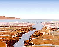 Signs of Heavy Flooding What caused these giant floods? Was it a climate change, perhaps brought about by a change in Mars's orbit? Or was the planet's own internal heat responsible? And, whatever mechanism caused the floods in the first place, where has all that water gone? Was it absorbed into the ground where it remains today, frozen? Or did it dissipate into the Martian atmosphere, where it was subsequently lost to space? No-one knows for certain the answers to these questions. Some scientists believe that the catastrophic floods that carved the outflow channels occurred nearly simultaneously, releasing such vast quantities of water that they merged into an ocean that covered the northern lowlands. Tim Parker of NASA's Jet Propulsion Laboratory first proposed such an idea in 1989. Parker, examining images taken by the Viking Orbiters, found what he believed were remnants of two ancient ocean shorelines, which he called "contacts," one inside the other, in the Martian north. Expanding on this notion, in 1991 Vic Baker of the University of Arizona, suggested that Mars might not be geologically dead and permanently frozen. Instead, he proposed, Mars might undergo cycles, or pulses -- first heating up, releasing groundwater and forming an ocean in the north, then dissipating the ocean back into the planet's crust and re-freezing. More recently, Jim Head and colleagues at Brown University, found evidence that is consistent with a shoreline that might indeed have existed at the inner of Parker's two proposed contacts, contact 2. Head and colleagues examined elevation data gathered by the Mars Orbiter Laser Altimeter (MOLA) on board the Mars Global Surveyor (MGS) and found that the elevation at points along contact 2 were much closer to a straight line than those at contact 1. They also found that the terrain below this elevation was smoother than the terrain above it. Both of these findings are consistent with the former presence there of an ocean. But the story doesn't end there. Shortly after Head and colleagues published their findings, Mike Malin and Ken Edgett of Malin Space Systems used the Mars Orbital Camera (MOC) aboard MGS, to take a series of high-resolution images of contact 2 terrain. Their conclusion: there's nothing there. And the debate continues. Says Mike Carr of the U.S. Geological Survey, author of the book Water on Mars, "We're getting all this new data from MGS, and I think a lot of it is just not understood yet. It's very hard to understand. The whole business of the oceans, the evidence is so contradictory."