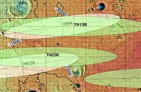Cameron Park - April 2, 2001 Although the rovers' Pathfinder-style hard-landing technique is very forgiving of rugged terrain, there are still serious engineering limits on possible landing areas. In order to get both enough daily sunlight and high enough temperatures to operate successfully for the minimum three months demanded of them, the rovers must land fairly close to the Martian equator -- "MER-A" (the first rover) between 5 deg North and 15 deg South; MER-B between 10 degrees North and 10 degrees South. For their braking parachutes to slow them down enough for a successful landing, they must land at sites more than 1.3 km below the average altitude of the Martian surface. Despite their ruggedness, it's dangerous for them to land on slopes of over 15 degrees -- that is, on steep hills, cliffs or crater walls -- or in excessively rock-strewn areas which could also be hard for the rovers to weave their way through after landing. Overly dusty areas would be safe to land on, but would also interfere with the rovers' travels because of traction and dust problems. Then there is the problem of their "landing ellipses" -- the very wide areas in which we can be confident they will touch down, given the built-in inaccuracies of their Earth-based navigational tracking. The cancelled 2001 lander would have featured an experimental new guidance system that would have guided it to within 10 km of its target point, but that test has now been postponed until 2007. The Vikings, Pathfinder and the Mars Polar Lander all landed within 30 km of their target points, but that may have been pure luck -- the 2003 rovers can only be sure of landing within a zone stretching 30 km north-to-south, and between 60 to 220 km east-to-west depending on the site's latitude. Therefore any landing site must be picked on the basis that a safe landing is essentially possible anywhere within that big landing ellipse. Despite all these limitations the first survey of Mars' surface for possible landing sites for 2003 found a surprising number of "safe" candidates -- 85 for MER-A and 68 for MER-B. These sites were chosen on the basis of:
