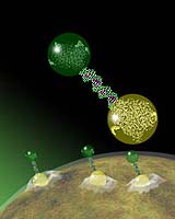 University of Michigan researchers have developed a faster, more efficient way to produce a wide variety of nanoparticle drug delivery systems, using DNA molecules to bind the particles together. Nanometer-scaled dendrimers can be assembled in many configurations by using attached lengths of single-stranded DNA molecules, which naturally bind to other DNA strands in a highly specific fashion. "With this approach, you can target a wide variety of molecules - drugs, contrast agents - to almost any cell," said Dr. James R. Baker Jr., the Ruth Dow Doan Professor of Nanotechnology and director of the Center for Biologic Nanotechnology at U-M. Nanoparticle complexes can be specifically targeted to cancer cells and are small enough to enter a diseased cell, either killing it from within or sending out a signal to identify it. But making the particles is notoriously difficult and time-consuming. The nanoparticle system used by Baker's lab is based on dendrimers, star-like synthetic polymers that can carry a vast array of molecules on the ends of their arms. It is possible to build a single dendrimer carrying many different kinds of molecules such as contrast agents and drugs, but the synthesis process is long and difficult, requiring months for each new molecule added to the dendrimer in sequential steps. And the yield of useful particles drops with each successive step of synthesis. For a paper published Jan. 21 in the journal Chemistry and Biology, U-M Biomedical Engineering graduate student Youngseon Choi built nanoparticle clusters of two different functional dendrimers, one designed for imaging and the other for targeting cancer cells. Each of the dendrimers also carried a single-stranded, non-coding DNA synthesized by Choi. In a solution of two different kinds of single dendrimers, these dangling lengths of DNA, typically 34-66 bases long, found complementary sequences on other dendrimers and knitted together, forming barbell shaped two-dendrimer complexes with folate on one end and fluorescence on the other end. Folate receptors are over-expressed on the surface of cancer cells, so these dendrimer clusters would tend to flock to the diseased cells. The other end of the complex carries a fluorescent protein so that the researchers can track their movement. A series of experiments using cell sorters, 3-D microscopes and other tools verified that these dendrimers hit their targets, were admitted into the cells and gave off their signaling light. The self-assembled dendrimer clusters were shown to be well formed and functional. "This is the proof-of-concept experiment," Choi said. But now that the assembly system has been worked out, other forms of dendrimer clusters are in the works. "If you wanted to make a therapeutic that targeted five drugs to five different cells, it would be 25 synthesis steps the traditional way," Baker said. At two to three months per synthesis, and a significant loss of yield for each step, that approach just wouldn't be practical. Instead, the Baker group will create a library of single-functional dendrimers that can be synthesized in parallel, rather than sequentially, and then linked together in many different combinations with the DNA strands. "So it's like having a shelf full of Tinker Toys," Baker said. An array of single-functional dendrimers, such as targets, drugs, and contrast agents, and the ability to link them together quickly and easily in many different ways would enable a clinic to offer 25 different "flavors" of dendrimer with only ten synthesis steps, Baker said. Baker foresees a nanoparticle cluster in which a single dendrimer carries three single-strands of DNA, each with a sequence specific to the DNA attached to other kinds of dendrimers. Put into solution with these other tinker toys, the molecule would self-assemble into a four-dendrimer complex carrying one drug, one target, and one fluorescent. Related Links Center for Biologic Nanotechnology U-M Biomedical Engineering Chemistry and Biology journal University of Michigan SpaceWar Search SpaceWar Subscribe To SpaceWar Express