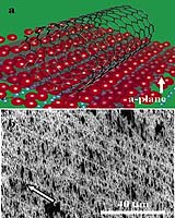 Zhou believes exploitation of the properties of sapphire his team investigated may allow production of the right kinds of dense, ordered arrays necessary. Sapphire is aluminum oxide, also known as the mineral alumina, the abrasive corundum, and when colored by small quantities of iron, ruby. It is readily available as a cheap synthetic. The crystal is six-sided, rising from a flat base, (see diagram, right) and has four natural planes on which it can be split to form thin, smooth slices: one parallel to the base, and three other vertical ones (see diagram). The self-guiding phenomenon was first reported last year by a research team at the Weizman Institute in Israel. Zhou's team systematically investigated the phenomenon. Certain vertical slices, particularly the a- and r-planes, exhibit the self-guiding nanotube behavior. The c-plane, parallel to the base did not. According to Zhou, two possibilities might explain the difference. One would be the arrangement of the atoms in the matrix; the other, differences in the "step edge" properties of the surfaces. Step edges are nanoscopic surface irregularities, minute rises from the suface level. To eliminate step edges as a possibility, Zhou's group annealed (treated with high, long-lasting heat) samples of both forms, and then tested. Annealing emphasizes step edges, and would accordingly emphasize the arrangement effect, if the effect was dependent on the edges. It did not. The basal, horizontal slices remained unable to self-guide nanotubes. The two of the vertical slices continued to do so. The behavior seems to be due to the varied arrangement of aluminum and oxygen atoms on the surface. Zhou's team is now investigating how the exact mechanisms at work, in order to further control the process. Zhou and his team have also, worked with quartz substrates for nanotube synthesis, which did not exhibit any guided growth. Zhou worked with Xiaolei Liu and Song Han on the research, which was supported by an NSF career Award, an NSF-CENS grant, and an SRC MARCO/ DARPA grant. Related Links USC Viterbi School of Engineering SpaceWar Search SpaceWar Subscribe To SpaceWar Express