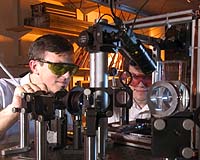 A team of physicists at the Georgia Institute of Technology has taken a significant step toward the development of quantum communications systems by successfully transferring quantum information from two different groups of atoms onto a single photon. The work, to be published in the October 22 issue of the journal Science, represents a "building block" that could lead to development of large-scale quantum networks. Sponsored by the Research Corporation and NASA, the work is believed to be the first to demonstrate transfer of quantum information from matter to light. The researchers, Assistant Professor Alex Kuzmich and graduate student Dzmitry Matsukevich � both from Georgia Tech's School of Physics � report transferring atomic state information from two different clouds of rubidium atoms to a single photon. In the photon, information about the spatial states of the atom clouds was represented as vertical or horizontal optical polarization. "A really big issue in quantum information systems today is distributed quantum networks, and for that, you have to be able to convert quantum bits of information based on matter into photons," Kuzmich said. "This is the first step, one building block. What we have done is create a quantum network node, and now the next step is to create a second quantum network node and connect them." Qubits, or quantum bits, are very different from the bits in conventional computing. Unlike conventional bits that exist in either a 0 or 1 state, qubits can simultaneously exist in both states. Qubits can also interact with other qubits, their properties "entangled" in ways unique to quantum systems. These odd properties mean quantum computers could provide dramatic advantages over conventional systems in certain types of computation that are difficult for conventional computers. The approach taken by Kuzmich and Matsukevich begins with two clouds of rubidium atoms, each cloud with a different state, forming a matter qubit. By passing a split beam of light separately through each cloud (also known as an ensemble) and then recombining it, they were able to create a qubit that was entangled with a single photon. Other research teams have been working to map states from a single atom onto a photon. Kuzmich says using the atomic cloud of very cold atoms as a matter qubit offers a simplicity advantage in creating the entanglement. "The state of the qubit is the collective state of the atomic ensemble," he explained. "Conversion from matter to light becomes efficient in one direction because emission from all the atoms add together to create a preferred forward direction, similar to how radio frequency antennas are able to emit directionally." Using optically thick atomic ensembles for the interface between matter and light in long-distance quantum communication was proposed in 2001 by a team of researchers (Duan, Lukin, Cirac and Zoller) from the University of Innsbruck in Austria. The Georgia Tech researchers built on that work, which has become known as the DLCZ protocol. Transferring a coherent quantum state from a matter-based qubit to a photonic qubit involves three main steps: An entangled state between a single photon (signal) and a single collective excitation distributed over many atoms in two distinct optically thick atomic samples is generated; Measurement of the signal photon maps the atomic ensembles into a desired state, conditioned on the choice of the basis and the outcome of the measurement. This atomic state is nearly a maximally entangled state between two distinct atomic ensembles; This atomic state is then converted into a single photon (idler) emitted into a well-defined mode. Conversion of quantum states from atomic-based systems to photonic systems is necessary for long-distance communication. While the matter-based systems can provide long-term storage of information, efficient transfer of information requires that it be converted into a photonic state for transmission across optical fiber networks. Once converted into a photonic qubit, the information can be processed and may not need to be converted back to a matter-based qubit. "If you want to realize a quantum repeater, you must have two such quantum nodes," Kuzmich explained. "But in this quantum communications approach, you don't ever need to convert the photon back to atomic format." For their research, the Georgia Tech physicists used light at a wavelength of 780 nanometers. For transmission in conventional optical fiber networks, however, they will have to switch to the 1550 nanometer wavelength that has become standard in the telecommunications industry. The Science paper reported on atom clouds containing approximately a billion rubidium atoms. Kuzmich says having 10 billion atoms compressed into the same space would boost efficiency. "We should be able to increase our efficiency by a factor of ten at least," he said. Practical applications are still at least 7-10 years away, Kuzmich estimates. Detailed Explanation of Experiment Diagram: A magneto-optical trap is used to provide an optically thick atomic cloud of a billion rubidium atoms for the experiment. The classical coherent laser pulses used in the generation and verification procedures define the two distinct pencil-shape components of the atomic ensemble that form the memory qubit, L and R. An infrared write pulse (780 nm wavelength) is split into two beams by a polarizing beam splitter (PBS1) focused into two regions of the atomic cloud about 1 mm apart and passed through it. The light induces spontaneous Raman scattering of a signal photon with slightly shorter wavelength. The classical light is dumped away by the PBS2, while the quantum signal photon is transmitted by the dichroic mirror DM, passed through an arbitrary polarization state transformer R and a polarizer PBS5, and is directed onto a single-photon detector D1. Detection of the signal photon by D1 prepares the atomic ensemble in any desired state and thereby con