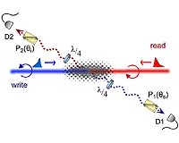 Quantum communication networks show great promise in becoming a highly secure communications system. By carrying information with photons or atoms, which are entangled so that the behavior of one affects the other, the network can easily detect any eavesdropper who tries to tap the system. Physicists at the Georgia Institute of Technology have just reached an important milestone in the development of these systems by entangling a photon and a single atom located in an atomic cloud. Researchers believe this is the first time an entanglement between a photon and a collective excitation of atoms has passed the rigorous test of quantum behavior known as a Bell inequality violation. The findings are a significant step in developing secure long-distance quantum communications. They appear in the July 29, 2005 edition of the Physical Review of Letters. Relying on photons or atoms to carry information from one place to another, network security relies on a method known as quantum cryptographic key distribution. In this method, the two information-carrying particles, photonic qubits or atomic qubits, are entangled. Because of the entanglement and a rule in quantum physics that states that measuring a particle disturbs that particle, an eavesdropper would be easily detected because the very act of listening causes changes in the system. But many challenges remain in developing these systems, one of which is how to get the particles to store information long enough and travel far enough to get to their intended destination. Photonic qubits are great carriers and can travel for long distances before being absorbed into the conduit, but they're not so great at storing the information for a long time. Atomic qubits, on the other hand, can store information for much longer. So an entangled system of atoms and photons offers the best of both worlds. The trick is how to get them entangled in a simple way that requires the least amount of hardware. Physicists Alex Kuzmich and Brian Kennedy think that taking a collective approach is the way to go. Instead of trying to isolate an atom to get it into the excited state necessary for it to become entangled with a photon, they decided to try to excite an atom in a cloud of atoms. "Using a collective atomic qubit is much simpler than the single atom approach," said Kuzmich, assistant professor of physics at Georgia Tech. It requires less hardware because we don't have to isolate an atom. In fact, we don't even know, or need to know, which atom in the group is the qubit. We can show that the system is entangled because it violates Bell inequality." "With single atoms, its much more difficult to control the system because there is so much preparation that must be done," said Kennedy, professor of physics at Georgia Tech. "For the collective excitation, the initial preparation of the atoms is minimal. You don't have to play too much with their internal state - something that's usually a huge concern." In addition to having the system pass the rigorous test of Bell inequality, researchers said they were able to increase the amount of time the atomic cloud can store information to several microseconds. That's fifty times longer than it takes to prepare and measure the atom-photon entanglement. Another challenge of quantum communication networks is that since photons can only travel so far before they get absorbed into the conduit, the network has to be built in nodes with a repeater at each connection. "A very important step down the road would be to put systems like this together and confirm they are behaving in a quantum mechanical way," said Kennedy. Related Links Georgia Institute of Technology SpaceWar Search SpaceWar Subscribe To SpaceWar Express