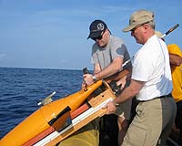 Two ocean-diving gliders built at the University of Washington were retrieved late last month near the Hawaiian island of Kauai after setting a world record by traveling a quarter of the way across the Pacific Ocean. Two other UW gliders, awaiting retrieval from the Labrador Sea, have set another world endurance record with a deployment of 193 days as of early April. The gliders set new marks for autonomous � or unmanned � underwater vehicles. Named "Seagliders" by their developers and builders at the UW's Applied Physics Laboratory and School of Oceanography, the UW gliders are sleek, torpedo-shaped vehicles some six feet long. They move through the water without propellers, repeatedly diving to collect oceanographic measurements. Gliders in general have the longest range of any autonomous underwater vehicles yet developed. Unlike floats used for oceanography that drift where ocean currents take them, gliders can be told to hold their positions or change direction by pilots using computers on land � in some cases, more than a thousand miles away. The Seagliders used in the Pacific Ocean were deployed in the water mid-way between California and Hawaii last September. They traveled the Pacific for 191 days, covering 1,860 miles. During that time one made 599 dives and the other 559. "Gliders are essential to solving many of our ocean observing problems," says Bruce Howe, oceanographer with the UW's Applied Physics Laboratory and principal investigator for work using the Seagliders in the Pacific as part of the North Pacific Acoustics Laboratory project. The project of ongoing experiments, a collaboration between the UW's Applied Physics Laboratory and Scripps Institution of Oceanography, is funded by the Office of Naval Research. The temperature, salinity and oxygen data gathered by the Seagliders will help the North Pacific Acoustics Laboratory scientists better understand acoustic propagation � how sound is affected as it moves through the ocean. Acoustics can be used to probe such things as long-term ocean temperature changes and climate variability, and the role of internal waves in ocean mixing, Howe says. Gliders also could be used to monitor changes in the world's oceans because of storms, such as hurricanes, and other natural events, such as El Nino. Sonar and other sensing devices mounted on gliders may one day routinely scan harbors and seaports for explosive mines or detect divers in areas where they don't belong. A Seaglider can dive from the surface down 3,300 feet and back up every 3 to 9 hours. It remains at the surface 5 minutes to transmit ocean data that it has collected, relay its position and receive instructions via the Iridium satellite phone network, before diving again. It travels at half a knot, driven not by a spinning propeller but by buoyancy control: a hydraulic system moves oil in and out of an external rubber bladder to force the glider up or down through the ocean. Moving its battery pack causes it to pitch its nose up or down or roll its wings to change compass heading. In the recent deployment in the North Pacific, UW engineers Jim Luby and Neil Bogue piloted one Seaglider on a direct course to Kauai, while the other was sent to gather data for 620 miles due west before being nudged southwest toward Kauai. Both were navigated around Kauai to where UW Applied Physics Laboratory's Jim Mercer and Jason Gobat led a team to retrieve them. Related Links About Seagliders SpaceWar Search SpaceWar Subscribe To SpaceWar Express