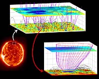 A Chinese-German team of scientists have identified the magnetic structures in the solar corona where the fast solar wind originates. Using images and Doppler maps from the Solar Ultraviolet Measurements of Emitted Radiation (SUMER) spectrometer and magnetograms delivered by the Michelson Doppler Imager (MDI) on the space-based Solar and Heliospheric Observatory (SOHO) of ESA and NASA, they observed solar wind flowing from funnel-shaped magnetic fields which are anchored in the lanes of the magnetic network near the surface of the Sun. These observations are presented in the April 22 issue of Science magazine. The research leads to a better understanding of the magnetic nature of the sources of the solar wind, a stream of tenuous and hot plasma (electrically conductive gas) that affects the Earth's space environment. The solar wind consists of protons, alpha particles (two-fold ionized helium), heavy ions and electrons flowing from the surface of the Sun with speeds ranging from 300 to 800 km/s. The heavy ions in the coronal source regions emit radiation at certain ultraviolet wavelengths. When they flow towards Earth, as they do when tracing the nascent solar wind, the wavelengths of the ultraviolet emission become shorter, a phenomenon called the Doppler effect, which is well known in its acoustic variant, for example, from the change in tone of the horn of a police car while approaching to or receding from the listener. In the solar case, plasma motion towards us, which means away from the solar surface, is detected as blue shift in the ultraviolet spectrum, and thus can be used to identify the beginning of the solar wind outflow. A SUMER ultraviolet spectrum is similar to what is seen when a prism separates white light into a rainbow of distinct colors. The ultraviolet radiation is however invisible to the human eye and cannot penetrate the Earth's atmosphere. By analyzing ultraviolet emission obtained by SUMER on the space observatory SOHO from space, solar physicists can learn a great deal about the Sun and infer the gas temperature, chemical composition, and motion in the various atmospheric layers. "The fine magnetic structure of the source region of solar wind has remained elusive" said first author Prof. Chuanyi Tu, from the Department of Geophysics of the Peking University in Beijing, China. "For many years, solar and space physicists have observed fast solar wind streams coming from coronal regions with open magnetic field lines and low light intensity, the so called coronal holes. "However, only by combining complex observations from SOHO in a novel way have we been able to infer the properties of the sources inside coronal holes. The fast solar wind seems to originate in coronal funnels with a speed of about 10 km/s at a height of 20,000 kilometers above the photosphere". "The fast solar wind starts to flow out from the top of funnels in coronal holes with a flow speed of about 10 km/s", states Prof. Tu. "This outflow is seen as large patches in Doppler blue shift (hatched areas in the above figure) of a spectral line emitted by Ne+7 ions at a temperature of 600,000 Kelvin, which can be used as a good tracer for the hot plasma flow. "Through a comparison with the magnetic field, as extrapolated from the photosphere by means of the MDI magnetic data, we found that the blue-shift pattern of this line correlates best with the open field structures at 20,000 km." The SUMER spectrometer scrutinized the sources of the solar wind by observing ultraviolet radiation coming from a large area of the northern polar region of the Sun. "The clear identification of the detailed magnetic structure of the source, now being revealed as coronal funnels, and the determination of the release height and initial speed of the solar wind are important steps in solving the problems of mass supply and basic acceleration", says Professor Eckart Marsch, co-author of the Science paper. "We can now focus our attention on studying further plasma conditions and physical processes that occur in the expanding coronal funnels and in their narrow necks anchored in the magnetic network". Solving the nature and origin of the solar wind is one of the main goals for which SOHO was designed. It has long been known to the astronomical community that the fast solar wind comes from coronal holes. What is new here is the discovery that these flows start in coronal funnels, which have their source located at the edges of the magnetic network. Just below the surface of the Sun there are large convection cells. Each cell has magnetic fields associated with it, which are concentrated in the network lanes by magneto-convection, where the funnel necks are anchored. The plasma, while still being confined in small loops, is brought by convection to the funnels and then released there, like a bucket of water is emptied into an open water channel. "Previously it was believed that the fast solar wind originates on any given open field line in the ionization layer of the hydrogen atom slightly above the photosphere", says Prof. Marsch, "However, the low Doppler shift of an emission line from carbon ions shows that bulk outflow has not yet occurred at a height of 5,000 km. "The solar wind plasma is now considered to be supplied by plasma stemming from the many small magnetic loops, with only a few thousand kilometers in height, crowding the funnel. "Through magnetic reconnection plasma is fed from all sides to the funnel, where it may be accelerated and finally form the solar wind." The SUMER instrument was built under the leadership of Dr. Klaus Wilhelm, who is also a co-author of the paper, at the Max Planck Institute for Solar System Research (formerly Max Planck Institute for Aeronomy) in Lindau, Germany, with key contributions from the Institut d'Astrophysique Spatiale in Orsay, France, the NASA Goddard Space Flight Center in Greenbelt, Maryland, the University of California in Berkeley, and with financial support from German,