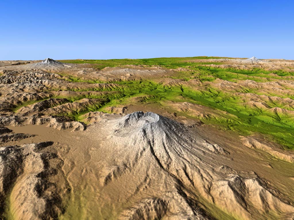 Mount Saint Helens is a prime example of how Earth's topographic form can greatly change even within our lifetimes. The mountain is one of several prominent volcanoes of the Cascade Range that stretches from British Columbia, Canada, southward through Washington, Oregon, and into northern California. Mount Adams (left background) and Mount Hood (right background) are also seen in this view, which was created entirely from elevation data produced by the Shuttle Radar Topography Mission. Prior to 1980, Mount Saint Helens had a shape roughly similar to other Cascade peaks, a tall, bold, irregular conic form that rose to 2950 meters (9677 feet). However, the explosive eruption of May 18, 1980, caused the upper 400 meters (1300 feet) of the mountain to collapse, slide, and spread northward, covering much of the adjacent terrain (lower left), leaving a crater atop the greatly shortened mountain. Subsequent eruptions built a volcanic dome within the crater, and the high rainfall of this area lead to substantial erosion of the poorly consolidated landslide material. Eruptions at Mount Saint Helens subsided in 1986, but renewed volcanic activity here and at other Cascade volcanoes is inevitable. Predicting such eruptions still presents challenges, but migration of magma within these volcanoes often produces distinctive seismic activity and minor but measurable topographic changes that can give warning of a potential eruption. Three visualization methods were combined to produce this image: shading of topographic slopes, color coding of topographic height, and then projection into a perspective view. The shade image was derived by computing topographic slope in the northeast-southwest (left to right) direction, so that northeast slopes appear bright and southwest slopes appear dark. Color coding is directly related to topographic height, with green at the lower elevations, rising through yellow and tan, to white at the highest elevations. The perspective view simulates the geometry of the surface as it would be viewed on a clear day. Elevation data used in this image were acquired by the Shuttle Radar Topography Mission aboard the Space Shuttle Endeavour, launched on Feb. 11, 2000. SRTM used the same radar instrument that comprised the Spaceborne Imaging Radar-C/X-Band Synthetic Aperture Radar (SIR-C/X-SAR) that flew twice on the Space Shuttle Endeavour in 1994. SRTM was designed to collect 3-D measurements of the Earth's surface. To collect the 3-D data, engineers added a 60-meter (approximately 200-foot) mast, installed additional C-band and X-band antennas, and improved tracking and navigation devices. The mission is a cooperative project between NASA, the National Geospatial-Intelligence Agency (NGA) of the U.S. Department of Defense and the German and Italian space agencies. It is managed by NASA's Jet Propulsion Laboratory, Pasadena, Calif., for NASA's NASA's Science Mission Directorate, Washington, D.C.