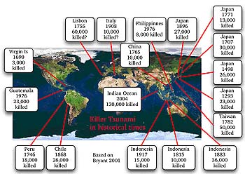 The Sydney Morning reports that Indian Seismologist Arun Bapat says he has been warning of the risk of a tsunami along the Indian coast for decades, yet no one was listening. "There have been four tsunamis in India in the last 100 years, and it is well-known that an earthquake of such a large magnitude generates a tsunami. There was no system in place." The final irony is that a system is in place to warn fisherman of an impending cyclone within minutes, with 500 receivers along the coast ready to broadcast in native languages. Indian Ocean tsunami are referred to in the scientific journal Science of Tsunami Hazards, as is the hazard to many other coastlines that are not usually associated with tsunami. Ted Bryant, an Associate Professor at the University of Wollongong in Australia has been studying tsunami since 1989, when he and colleagues first came to the radical conclusion that a "mega-tsunami" some 500 years ago was responsible for a range of strange geological along the southern New South Wales coast. He eventually wrote a text book with the portent title "Tsunami - the underrated hazard". The summary states "Between 1990 and 2000 over ten major tsunami events have impacted on the world's coastlines, causing devastation and loss of life. Evidence for past great tsunami, or 'mega-tsunami', has also recently been discovered along apparently aseismic and protected coastlines. With a large proportion of the world's population living on the coastline, the threat from tsunami cannot be ignored." The book documents the many devastating tsunami that have struck in historical times (see maps). Bryant notes that, so far, only coastlines of the South Atlantic lack evidence of significant tsunami. Tsunami in the Pacific Ocean alone have caused over 460,000 fatalities. The destructive power of a major tsunami, as described in Bryant's book, is demonstrated in the before and after photographs of the towns devastated in the Indian Ocean tsunami. Sealed roads have been ripped apart, train carriages washed hundreds of metres and coastlines radically altered.