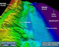 The British Navy surveying the seabed at the epicenter of December's Indian Ocean earthquake released its first images Wednesday that indicate a landslide occurred where two plates came together in a ridge. The Royal Navy's HMS Scott has been taking underwater sonar readings off the Indonesian island of Sumatra to try to find out how the December 26 earthquake unfolded and then produced the giant waves that have killed nearly 300,000 people in 11 countries. The colored digital mapping, displayed at the United Kingdom Hydrographic Office in Taunton, Somerset, showed a large landslide some 100 metres high by two kilometres in length. HMS Scott's Commanding Officer Steve Malcolm said initial assessments by scientists indicate two of the earth's tectonic plates came together, causing a ridge on the seabed which forced sea water to travel upwards to form the devastating tsunami. They must have clashed "like the rumpling up of a carpet," he said. He said he hoped the survey would give a warning as to when this could happen again "with the aim of removing the likelihood of such a terrible loss of life". HMS Scott's survey will provide the "base map" for future extensive research into the process of how earthquakes work and how they produce tsunamis. Data will help produce charts to build a picture of what happened on December 26 and what might happen next. The commander said it was hoped the Indonesian government would permit the release of as much information as possible to the wider local community "to give warning to prevent such a tragedy happening again". He said the survey, which began in late January, and its images, though unable to give exact predictions of when earthquakes will occur, could indicate a level of risk. The depth of the water in the area of the epicenter varies between 200 and 5,000 meters (670 and 16,700 feet), all of which is within the HMS Scott's capability, scientists say. The epicenter of the quake, which measured a massive 9.0 on the Richter scale, lies within the Indonesian Exclusive Economic Zone. The survey will fall under the definition of Marine Scientific Research under the United Nations Convention on Law of the Sea. HMS Scott sailed from Plymouth's Devonport Naval Base in November last year to undertake a program of military-based data gathering in the North Atlantic, Arabian Sea and Indian Ocean. All rights reserved. � 2004 Agence France-Presse. Sections of the information displayed on this page (dispatches, photographs, logos) are protected by intellectual property rights owned by Agence France-Presse. As a consequence, you may not copy, reproduce, modify, transmit, publish, display or in any way commercially exploit any of the content of this section without the prior written consent of Agence France-Presse. Related Links SpaceWar Search SpaceWar Subscribe To SpaceWar Express
