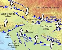 New NASA research confirms that northern metropolitan Los Angeles is being squeezed at a rate of 5 millimeters (0.2 inches) a year, straining an area between two earthquake faults that serve as geologic bookends north and south of the affected region. The compression of the Los Angeles landscape is being monitored by a network of more than 250 precision global positioning system receivers known as the Southern California Integrated Global Positioning System Network, as well as by measurements from interferometric synthetic aperture radar (InSAR) satellites operated by the European Space Agency. Information from these two sources of precision ground deformation measurements is accumulating and enhancing our knowledge of the forces shaping the land surface in the Los Angeles region. These forces include motion along faults due to motions of the North American and Pacific tectonic plates and ground movement caused by human activities, such as oil drilling and pumping water into and out of local aquifers. A team led by Dr. Donald Argus of NASA's Jet Propulsion Laboratory, Pasadena, Calif., that includes scientists from the University of California at Los Angeles, set out to distinguish between motions induced by human activity and those generated by movements of Earth's tectonic plates. Their results, recently published in the Journal of Geophysical Research, indicate the human-caused motions are very slow and could not account for the significant ground shift observed in northern Los Angeles. The new study used space-based navigation to determine the exact position of hundreds of points around the metropolitan area to measure the strain building up across faults. Scientists believe the strain will ultimately be released in earthquakes much like the 1994 Northridge temblor. The study also suggests which faults might be most likely to rupture. "These findings remove uncertainty about the rate at which strain is building up in northern metropolitan Los Angeles," Argus said. "In addition, by taking into account the effects of humans and observations from the many new global positioning system sites established in the past few years, we can identify the areas where strain is building the fastest." He cautioned, however, that more studies are needed, since scientists do not yet fully understand the consequences and risks of this stress accumulation. "Nevertheless, these data have important implications for hazard management and retrofitting strategies," Argus said. The study finds strain is rapidly accumulating within an area 12 to 25 kilometers (7.5 to 15.5 miles) south of the San Gabriel Mountains, primarily in the San Gabriel and San Fernando Valleys and nearby hills. The region is located between the Puente Hills fault, which begins south of downtown Los Angeles and extends east, and the Sierra Madre fault, which runs along the base of the San Gabriel Mountains. The new analysis indicates the crust above the Los Angeles segment of the Puente Hills Fault is being squeezed the most. The finding suggests that the Puente Hills Fault and nearby faults in the area, such as the upper Elysian Park Fault, may be more likely to break than those elsewhere in metropolitan Los Angeles. Previous studies have estimated the Puente Hills Fault might generate an earthquake of magnitude 6.6 to 7.5. The researchers constructed models of the accumulating strain, varying which faults "creep" (move continuously without producing earthquakes), how fast they creep, and the depths at which the faults go from being "locked" in place (and building strain) to creeping. The model that best fit their actual global positioning system observations is one where a thrust fault (a fault where one block of Earth shifts up or down relative to the other) is locked above 6 kilometers (3.7 miles) deep and creeps at about 9 millimeters (0.4 inches) a year beneath that depth. From that model, they inferred that the deep part of the Los Angeles segment of the Puente Hills Fault is creeping, as is a deep unknown buried fault east of downtown that lies north of the Whittier Fault and south of the Sierra Madre Fault. The model does not allow scientists to infer which fault segments are locked, however. Argus said a significant discrepancy exists between the relatively shallow locking depth of their model and the historical record showing that earthquakes that struck the region in 1971 and 1994 were much deeper. Scientists speculate the discrepancy may be due to the presence of sediments filling parts of the Los Angeles basin. Further studies are planned to examine how these sediments may be affecting fault strain in the region. The study used InSAR data collected from 1992 to 2000 from the European Space Agency's European Remote Sensing satellites to estimate vertical ground motion. Horizontal strain buildup measurements were made from Southern California Integrated Global Positioning System Network observations from 1994 to 2004. Related Links SpaceWar Search SpaceWar Subscribe To SpaceWar Express