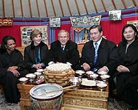 American Forces Press Service Washington (SPX) Nov 22, 2005 President Bush Monday thanked the people of Mongolia for helping bring about "a stunning transformation" in Iraq that he said is introducing freedom and democracy to people who had lived under tyranny and terror. Bush became the first U.S. president to visit Mongolia, where he met with President Nambaryn Enkhbayar inside a ceremonial tent and inspected a Mongolian color guard before delivering an address at the Government House in Ulaanbaatar. The president praised Mongolia for making its own transformation to democracy and an open economy, and said it has set an example for other countries around the world. "Many of you still recall the exhilaration of voting freely for the first time after decades of tyranny" and of electing leaders and living under a constitutional that guarantees personal liberties, Bush told the crowd. "And now, because of the courage of Mongolian and coalition forces, the people of Iraq know this feeling as well." In September, Mongolia sent its fifth rotation of forces to Iraq, where they are serving "with courage and great distinction," Bush said. Mongolian forces also are helping to train the Afghan military. The president singled out two Mongolia soldiers, Sts. Azzaya and Sambuu-Yondon, who risked their lives to stop a suicide bomber who was attempting to drive a truck full of explosives into a coalition mess tent in Iraq. As the truck hurtled toward them, the soldiers opened fire, killing the terrorist before he could strike. "As commander in chief of the United States armed forces, I thank these brave Mongolian soldiers, and all who have served on the front lines of the war on terror," Bush said. "The Mongolian armed forces are serving the cause of freedom and the United States armed forces are proud to serve beside such fearless warriors." Like the communism that gripped Mongolia for decades, Islamic radicalism that terrorizes Iraq and other countries around the world will fail, Bush said. "Free people did not falter in the Cold War, and free people will not falter in the war on terror," he said. "We see the determination to live in freedom in the courage of Iraqi and Afghan citizens who defied the terrorists to cast their ballots," he said. "And we've seen it in the daily courage of the Mongolian people who claimed their freedom 15 years ago, and are now standing with others across the world to help them do the same." Bush announced Mongolia's eligibility for assistance under the Millennium Challenge Account, a new U.S. program that helps countries continue their ongoing reforms. In addition, Mongolia will receive $11 million under the new U.S. Solidarity Initiative, which helps countries supporting the war on terror improve their military forces, the president said. Defense Secretary Donald H. Rumsfeld visited Mongolia on Oct. 22, when he praised the country's peacekeeping efforts and expressed personal thanks to almost 200 Mongolian soldiers who had served in Iraq and Afghanistan. "You are a sovereign nation, and you made a choice," Rumsfeld said of Mongolia's decision to support the war on terror during his visit to Ulaanbaatar. "It showed political courage, and it showed personal courage on the part of your troops." Related Links SpaceWar Search SpaceWar Subscribe To SpaceWar Express