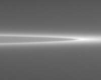 This contrast-enhanced view of Saturn's faint G ring shows its extremely sharp inner edge and more diffuse outer boundary. Using its large high-gain antenna as a shield, the Cassini spacecraft flew through the region interior to the G ring during insertion into Saturn orbit. The spacecraft was struck many times by the fine icy particles that populate the region between the F and G rings.