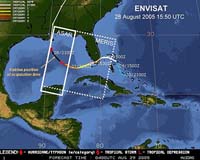 Paris (ESA) Aug 30, 2005 ESA's multi-sensor Envisat satellite has gathered a unique view of Hurricane Katrina in the Gulf of Mexico. While an optical image shows characteristic spiralling cloud patterns, a simultaneous radar observation pierces through the clouds to show how Katrina's 250-kilometre-an-hour an hour winds scour the sea surface. Envisat simultaneously acquired these images at 1550 UTC (1150 US Eastern Daylight Saving Time) on 28 August, with its Medium Resolution Imaging Spectrometer (MERIS) and Advanced Synthetic Aperture Radar (ASAR). At the time of acquisition Hurricane Katrina was a maximum Category Five on the Saffir-Simpson scale. Further ESA acquisitions are being prioritised because the International Charter on Space and Major Disasters has been activated. The eye of the hurricane is seen clearly in both images, with the wall of the eye clearly visible in the MERIS image, the area of the hurricane where the fastest winds and highest rainfall is found. The ASAR instrument works by recording signal backscatter based on surface roughness: the wind-free storm centre � seen enclosed within a dark ring feature measuring approximately 60 kilometres across - shows up darker because the waters here are hardly rippled by comparison to the sea around it. Hurricane Katrina, which formed in the Bahamas in mid-August, struck South Florida on 25 August, killing nine people and leaving a million more without electricity. It is poised to strike coastal Louisiana and New Orleans. Hurricane-strength winds of at least 119 kilometres per hour currently extend 136 kilometres from its centre. Katrina has today dropped from a maximum Category Five to a Category Four storm on the Saffir-Simpson scale, but forecasters warn it could again grow in intensity having made landfall. With serious flooding anticipated in the hurricane's wake as well as direct storm damage, the US Geological Service (USGS) activated the International Charter on Space and Major Disasters on 27 August. ESA is a founding member of the Charter, which represents a joint effort by global space agencies to put resources at the service of rescue authorities responding to major natural or man-made disasters. To date the Charter has been activated more than 80 times.