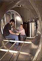 Houghton - Jan 14, 2001 It may sound like Isaac Asimov made it up, but on at least one level, there's nothing fancy about ion space propulsion. Many satellites fly in a steady, 24-hour orbit, so they essentially hang in one spot above the Earth. After awhile in space, however, they can get wobbly and then drift uselessly out of their intended orbit along with their gazillion dollars worth of electronics. To prevent this expensive debacle, ion propulsion engines mounted on the satellites send out streams of ions almost daily to stabilize the spacecraft, a process known as station keeping. "There's nothing special about ions," says Assistant Professor Brad King (ME-EM). "You could throw toasters off the back and it would do the same thing." It would certainly be cheaper to use toasters, if that were the only issue. Ion-propulsion engines are typically fueled with xenon, one of the so-called noble gases on the periodic table. "I think God has a sense of humor," King said. "The gas with the best performance also happens to be the most expensive that you can buy." The nice thing about ions, however, is that, unlike toasters, they throw themselves. "We use ions because they are positively charged, and the spacecraft is given a positive charge, so they repel each other," King said. "The ions come screaming out the back at 20 km per second." That's pushing 45,000 mph. Pound for pound, that's a lot of thrust, which is why the aerospace industry is becoming so fond of the ion-propulsion engines known as Hall-effect thrusters. Satellites have been around a lot longer than Hall thrusters, and much of King's work has focused on integrating these engines into existing satellite designs. There's plenty of capital available to do that. Getting mass into orbit is astonishingly expensive, and fuel for station keeping can eat up to 60 percent of a satellite's weight. "If we can cut the amount of fuel in half for a given satellite, we can save $100 million by using a smaller launch vehicle to put it in orbit," King said. For that kind of money, companies will gladly undertake a high-end retrofit on their traditional satellites. Now, however, King is turning his attention to bigger and better ion-propulsion engines. The typical 1-kilowatt ion engine developed in the 1990s generates thrust equal to the weight of a couple paperclips, which is quite adequate for station keeping. (Ion thrusters are also good for long trips; one has been powering NASA's Deep Space 1 probe on its drive to the outer planets.) To expand their capabilities, however, much more powerful engines are needed. "Now we're working on the next generation of thrusters," King said. In the next five to 10 years, researchers expect to design thrusters that work at over 30 kilowatts. "Those would be powerful enough to significantly raise the orbit of a satellite, rather than just keep it in place," he said, something that until now only chemical propellants have had the power to do. "A 30-kilowatt thruster would cut chemical rockets out of the loop for most satellite maneuvers," King said, drastically reducing the cost of launching a satellite. As efficient as they are, Hall thrusters have an unfortunate side effect. Xenon ions traveling at 20 km per second can wreak havoc on a molecular scale, which brings us to another aspect of King's research. Once they're in orbit, satellites get most of their power from a solar array, which converts sunlight to electricity. As the ions fly out, they disperse and can slam into the arrays, blowing away molecules from the lens that collects the sunlight. Over time, the effect is not unlike sandblasting. "That ruins the efficiency of the solar array," King said. To solve the problem, King and graduate student Alex Kieckhafer are investigating "beam divergence": designing the Hall thruster and satellite to keep the ions from spraying into the spacecraft. Working on ion propulsion systems requires an unusual grade of equipment. Trying to make outer space in the U.P. can be difficult," King notes as he ushers a visitor into his lab. The first thing you need is a place to hold your vacuum, in this case, a cylindrical stainless steel tank four meters long and two meters wide with walls three-quarters of an inch thick. "I got it at an aerospace surplus place in California," King said. "They didn't know what it was, so they sold it cheap." Its two massive doors were built closer to home, at Calumet Machine. To make outer space in the basement of the ME-EM building, a powerful pump sucks most of the air out of the tank. Then liquid helium circulates through a special carbon pad on its inside; virtually all of the remaining air freezes onto the pad. The interior is then nearly as air-free as outer space, making it a good place to test ion propulsion engines. The pumps must also be able to remove the ejected xenon propellant, which they can do at a rate of 60,000 liters per second. Clearly, Hall-effect thrusters are not the easiest type of engine to study. King doesn't seem to mind. "They're fun," he says. "Kind of like Buck Rogers, but real. And you have an audience -- you don't have to sit in the basement, write papers and stick them in file cabinets." For his next project, he envisions another Star Trekkian device that would hold a group of information-gathering satellites in formation. If each carried a small telescopic lens, they could function as a many-faceted insect eye, providing better images less expensively than a single, huge, Hubble-style lens. But to work, they'd have to maintain a very tight flight pattern. What would that take? King smiles. "I'm trying to build a realistic tractor beam." Related Links Michigan Technological University SpaceDaily Search SpaceDaily Subscribe To SpaceDaily Express