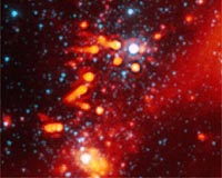 Pasadena CA (SPX) Dec 17, 2008 Some stars have it tough when it comes to raising planets. A new image from NASA's Spitzer Space Telescope shows one unlucky lot of stars, born into a dangerous neighborhood. The stars themselves are safe, but the material surrounding them - the dusty bits of what might have been future planets - can be seen blowing off into space. The hazard in this particular nook of space is a group of behemoth stars. Radiation and winds from the massive stars are wiping smaller, sun-like stars clean of their planet-making material. "We are seeing the effects that massive stars have on smaller stars that are trying to form planets," said Xavier Koenig, lead author of a paper about the discovery, recently published in the Astrophysical Journal Letters. "These stars may or may not go on to form small, inner planets like the Earth, but it's probable that outer planets like Uranus and Neptune would never come to be." Many stars and planets do in fact grow up and survive the harsh environments of massive stars. Some astronomers say our middle-aged sun, though now sitting in a tranquil patch of space, once resided in a raucous, massive star-forming cloud. Over time, stars in these turbulent regions disperse and spread out, spending their later years in relative solitude. The new Spitzer observations illustrate just how nasty these massive star-forming regions can be. It shows a portion of an active star-forming nebula called W5, located about 6,500 light-years away in the constellation Cassiopeia. Radiation and winds from a hub of four stars, each about 20 times as massive as our sun, are stripping the planet-forming material right off of three young, sun-like stars about one light-year away. The sun-like stars are about two to three million years old - the age when stars are thought to begin forming planets out of disks of gas and dust that swirl around them. The dust from these disks is visible in the Spitzer image as comet-like tails pointing away from the destructive massive stars. Spitzer, an infrared observatory, can see this dust from the disks because the dust is warm and glows with infrared light. Since the telescope was launched more than five years ago, it has identified a handful of disks being blown from their stars. "On astronomical timescales, these events are probably fairly short-lived," said Koenig. "It probably takes about one million years for the disks to completely disappear." Koenig said that the dust being swiped away is from the outer portion of the stars' planet-forming disks - around where Uranus and Neptune would orbit in our solar system and beyond. That means it's possible that any baby Earths forming in these faraway systems would grow up safely. Outer planets, on the other hand, might be nothing more than dust in the wind. Share This Article With Planet Earth