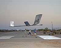 Yuma AZ (SPX) Aug 26, 2008 Zephyr's reputation as the world's leading solar powered high-altitude long-endurance (HALE) Unmanned Aerial Vehicle (UAV) has been reinforced with a world-beating three and a half day flight at the US Army's Yuma Proving Ground in Arizona. The solar powered plane flew for 82 hours 37 minutes, exceeding the current official world record for unmanned flight which stands at 30 hours 24 minutes set by Global Hawk in 2001 and Zephyr's previous longest flight of 54 hours achieved last year. The UK Ministry of Defence has funded the development of Zephyr to date and has partnered with the US Department of Defense (DoD) under their Joint Capability Technology Demonstration (JCTD) Programme - which is designed to move urgently needed technologies rapidly into the hands of US forces in the field. The US DoD funded the demonstration flight under the Programme and this was the first time the two governments have participated in a joint demonstration of a HALE UAV. JCTD projects are specially tailored to meet the needs of US combatant commands. Zephyr is supported by USCENTCOM, the combatant command with responsibility for Iraq and Afghanistan, along with the Office of Secretary of Defense (OSD) for Advanced Systems and Concepts (AS and C) and the US Army Space and Missile Defense Command (SMDC). Launched by hand, Zephyr is an ultra-lightweight carbon-fibre aircraft. By day it flies on solar power generated by amorphous silicon solar arrays no thicker than sheets of paper that cover the aircraft's wings. By night it is powered by rechargeable lithium-sulphur batteries, supplied by SION Power Inc, which are recharged during the day using solar power. The flight trial at Yuma took place between 28 and 31 July in the harsh conditions of the Sonoran Desert in mid summer with temperatures up to 45oC (113oF). Zephyr was flown on autopilot and via satellite communications to a maximum altitude of more than 60,000ft. The trial included a military utility assessment of a US Government communications payload. Simon Bennett, Managing Director of QinetiQ's Applied Technologies business said: "The Yuma Proving Ground in Arizona was an appropriate setting for Zephyr's world beating flight as many landmark aviation developments have taken place there in recent years. In addition to setting a new unofficial record, the trial is a step towards the delivery of Zephyr's capability for joint, real-time, battlefield persistent surveillance and communications to forces in the field at the earliest opportunity." Community Email This Article Comment On This Article Share This Article With Planet Earth