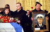 by Marina KorenevaSt Petersburg (AFP) Mar 23, 2002 The families of men who died in the sinking of the Kursk nuclear submarine honoured the last seven victims as they were laid to rest following a memorial service in Saint Petersburg on Saturday. An Russian Orthodox priest presided at the funeral for the seven men, who included Kursk commander Gennady Lyachin, at the Peter the Great military institute. The service was broadcast nationally on the NTV television network. Another brief service was held at the city's Serafimskoe cemetery, and many of the relatives were in tears as three volleys rang out after the coffins, borne by an honour guard of cadets, were laid in the ground in the cemetery's "heroes' section." The seven sailors were among the 118 crew on board who died when the nuclear-powered submarine sank under still unexplained circumstances in the Barents Sea on August 12, 2000. Their bodies had been the last to be identified, Russian Navy spokesman Igor Dygalo told AFP. Lyachin was the last to be buried, in line with naval tradition. One of those attending the memorial service held a portrait of Lyachin bearing the legend "Heroes of the Kursk". "Today we say goodbye to the heroes of our fleet," the commander of the Russian Navy Admiral Vladimir Kuroyedov said. "At the cost of their own lives, the commander and his team saved hundreds of thousands of other people's lives in northern Russia and in the Scandinavian countries by preventing a possible explosion of the nuclear reactor" on board the submarine, he said. All Russian warships in the Northern Fleet -- which ply the Barents Sea -- as well as those in the Pacific Ocean, the Baltic and the Black Seas on Saturday lowered their flags to half-mast as a sign of respect, on Kuroyedov's orders, RIA Novosti news agency said. After a long and painstaking operation which ended only this month, the authorities identified 115 of the 118 bodies or fragments of bodies recovered from the seabed. The wreck of the Kursk was raised last October and transferred to dry dock in Roslyakovo near the northern port city of Murmansk. In February, Kuroyedov gave the firmest indication to date that a torpedo explosion destroyed the Kursk, but was cautious not to say it was the definitive cause of the tragedy. A preliminary report said a defective torpedo filled with a cheap but very volatile fuel that has not been used in Western navies in over four decades probably caused the disaster. A final report is to be published in the latter half of the year. Russia's Northern Fleet has been virtually confined to port since the Kursk sinking. Related Links SpaceDaily Search SpaceDaily Subscribe To SpaceDaily Express