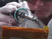 Huntsville AL (SPX) Aug 17, 2004 Richard Grugel, a materials scientist at the Marshall Space Flight Center, watched his video monitor in disbelief. A transmission from the International Space Station was playing. The scene: Astronaut Mike Fincke touches the tip of a soldering iron to a wire wrapped with rosin-core solder. Here's what happened: The solder, heated, became a molten blob with a droplet of rosin clinging tight to the outside. Solder melts: that's not too surprising. It's the behavior of the rosin that amazed. As the temperature increased, the droplet began to spin, round and round, faster and faster, like a miniature carnival ride. "What a surprise," says Grugel. "I've never seen anything like it." Grugel is the principal investigator of the In-Space Soldering Investigation, or "ISSI" for short, which Fincke was doing at the time of the discovery. ISSI's purpose is to find out how soldering works in a weightless environment. This is important information for astronauts. If something breaks during a long trip to Mars, they'll likely reach for a soldering iron to repair it. Researchers have long known that soldering in space isn't the same as soldering on Earth. Here on Earth, gravity pulls molten solder down over the metals to be joined. In space, weightless solder doesn't flow down. It tends to gather in blobs held together by surface tension. Trapped inside those solder-blobs, Grugel believes, are tiny bubbles of gas, vaporized rosin and steam, that weaken the joint and lessen its electrical and thermal conductivity. The solder Fincke used for ISSI is a mixture of lead, tin and rosin. The purpose of lead and tin is to form an electrically conducting connection. What does the rosin do? Grugel explains: "When metals are exposed to air, they become coated with oxides." Iron, for example, rusts: iron oxide. "The purpose of rosin," he says, "is to wash away any oxides before the lead and tin solidify, clearing the way for a good strong connection." Clearly, though, some of the rosin is too busy flying around to do its job properly. Is this a problem? To find out, Grugel plans to slice the blobs created by Fincke and examine what lies inside. He'll be able to see how many weakening bubbles are in there, and whether the solder made a clean connection to the wire. The samples will be returned to Earth by astronauts in a Soyuz capsule or, perhaps, after the space shuttle returns to flight. The date isn't set. Meanwhile, Grugel and his colleagues are brainstorming, trying to understand what causes the rosin to twirl. "We almost have it," Grugel says, but he's not ready to announce a solution yet. He does, however, have some advice for astronauts bent on soldering: wear your goggles and watch out for flying rosin. Related Links ISSI at NASA SpaceDaily Search SpaceDaily Subscribe To SpaceDaily Express