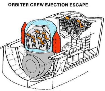Manoa - Nov 04, 2003 A few days ago a parcel arrived on my front porch. It contained a new high-intensity halogen reading lamp to replace one that died after 13 years of faithful service. When unpacked, it proved to have a sinister new feature: a six-inch-long steel loop thrusting menacingly downward from the bulb housing. The Safety Nannies had struck again! We all know and fear the Safety Nannies. They lurk in government offices and "consumer protection" groups throughout the world. Their official goal is protect us from accidental death and injury. Their true program is the eugenic modification of the human race into food animals. They pursue this twisted dream through laws and regulations intended to stop natural selection, by preserving idiots who in past ages died of sheer stupidity before they could breed. It was the Safety Nannies that made me stop visiting California. Even before they leave the airport boarding tubes at LAX, debarking passengers are confronted with big signs warning them against smoking anything but "medicinal marijuana", driving while drunk, and marrying their sisters. Other Safety Nannies invented that kinky mechanism that automatically wraps you in a bondage harness when you enter a car, and then gave us exploding dashboard airbags. And now they have ruined the design purity of the classic gooseneck lamp. I don't know what inspired these jackbooted thugs to impose the Steel Loop Rule on the lamp industry. Possibly a retarded child let his lamp fall down onto some inflammable paper and burned down an orphanage. Most likely there was no such incident, and a Safety Nanny just thought up the Loop Rule while idly toying with a riding crop. But now, all high-intensity lamps must have a long ugly obstruction extending a mandated distance from the bulb, to protect idiots from placing flammable items or their thick heads too close. We have our share of Safety Nannies in the space community too. They are the people who demand that space flight made as safe as commercial airplane travel, regardless of cost. In general, they are not a threat. Certainly they are not as dangerous as the steely-eyed, square-jawed fanatics at the other end of the spectrum, who demand that we press on with the Space Shuttle regardless of losses and regard the growing astronaut body count as a positive sign of national virility and purpose. But one group of Space Nannies has caused considerable confusion during our ongoing post-Columbia debate about Shuttle safety: the late and unlamented NASA Aerospace Safety Advisory Panel, a board of independent advisors established in 1967 at the initiative of one Congressman Donald Rumsfeld. The ASAP had waged a long and inept struggle to persuade NASA to install a "full-capability" crew escape system in the Shuttle orbiter, which culminated in a contentious public meeting with Sean O'Keefe on March 26. The ASAP showed an astonishing lack of technical knowledge and political acumen during this event. To understand how unworkable the Advisory Panel's solution is, you have to know that the ASAP's own definition of a "full-capability escape system" is one that works in all phases of flight -- including reentry! This makes a good sound bite but such a system is just plain impossible. No manned spacecraft has ever met this unreasonable requirement, and none ever will. Launch escape can only reasonably be achieved by pulling the whole spacecraft away from a failing booster. Unfortunately, the Shuttle's configuration makes this tradition method impossible (as was proven by numerous studies during its design phase). So the Space Nannies fell back on the concept of "bailing out" so familiar to airplane pilots. The specific proposal presented by former pilot-astronaut Sid Gutierrez would shift the five Shuttle "passengers" into a escape capsule mounted in the Shuttle cargo bay and give the two "pilots" encapsulated ejection seats like those of the B-58 supersonic bomber. The pilots would have only a slight chance of survival with this system. Any ejection seat based on the B-58 design is not going to work during most of reentry and a large part of ascent. Even for the much less demanding flight conditions of the B-58, only about half of the distressed crewmen who should have been saved by the encapsulated seat actually survived. But the main escape capsule is almost as big a problem. This amounts to a whole second reserve spaceship, capable of surviving reentry at orbital velocity and making a soft landing on either sea or land. Furthermore, it needs some system to separate it from the Shuttle orbiter (which is probably spinning out of control and breaking up) and also the External Tank (which is probably exploding). It is difficult to imagine how such a system could be made to work reliably. Gutierrez presented some artist's concepts of this escape system, of which the most detailed is reproduced here. It demonstrates that the Space Nannies had not bothered to examine the idea in any detail, despite having loudly advocated it for at least 3 years.