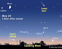 Here is an overview of what to expect. The two arriving visitors are named Comet Linear and Comet Neat, after the search programs that found them (Lincoln Near-Earth Asteroid Research, which uses a pair of telescopes in New Mexico, and the Near-Earth Asteroid Tracking program, which uses telescopes in California and Hawaii). Right now, Comet Linear is hard find to in the bright glow of dawn just above the eastern horizon before sunrise, and Comet Neat is visible only from the Southern Hemisphere. But that will soon change. For now, in the final week of April and the first few days of May, North American and European skywatchers do have a shot at spotting Comet Linear before dawn on clear mornings. Scan with binoculars just above the horizon due east about 60 minutes before your local time of sunrise. (There's a chance that observers may detect another comet, Comet Bradfield, somewhat to the left of Linear on April 24th and for the next few mornings. But the chances for this one are slimmer.) In subsequent weeks both Linear and Neat will come into in the evening sky, where they'll be in more convenient view. Starting around May 5th or 6th, scan for Comet Neat just above the southwest horizon as evening twilight fades. You're looking for a small, fuzzy "star" with a small tail pointing to the upper left. [The much brighter star Sirius will also be low in the southwest; on May 5th the comet will be not far to its left, and on May 6th the comet will be to Sirius's upper left.] In the next two weeks Comet Neat will get much higher in the southwest at nightfall, though it will also fade. Binocular users may be able to follow it through the end of May. Around May 26th or 28th, Comet Linear could steal the show when it too enters the evening sky. Look for it just above the west-southwest horizon as twilight fades. It will get only a little higher in the following week or two, while fading rapidly. Full details, including charts showing when and where to look for both comets (from the Southern Hemisphere too!) Appear in the May 2004 issue of Sky & Telescope and in the article "The Double Comet Show of 2004". Related Links Sky and Telescope SpaceDaily Search SpaceDaily Subscribe To SpaceDaily Express